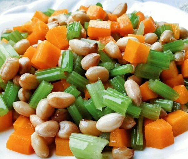 3.再把花生米芹菜胡萝卜放碗里,放入葱油,或香油加白糖,生抽盐调味即可