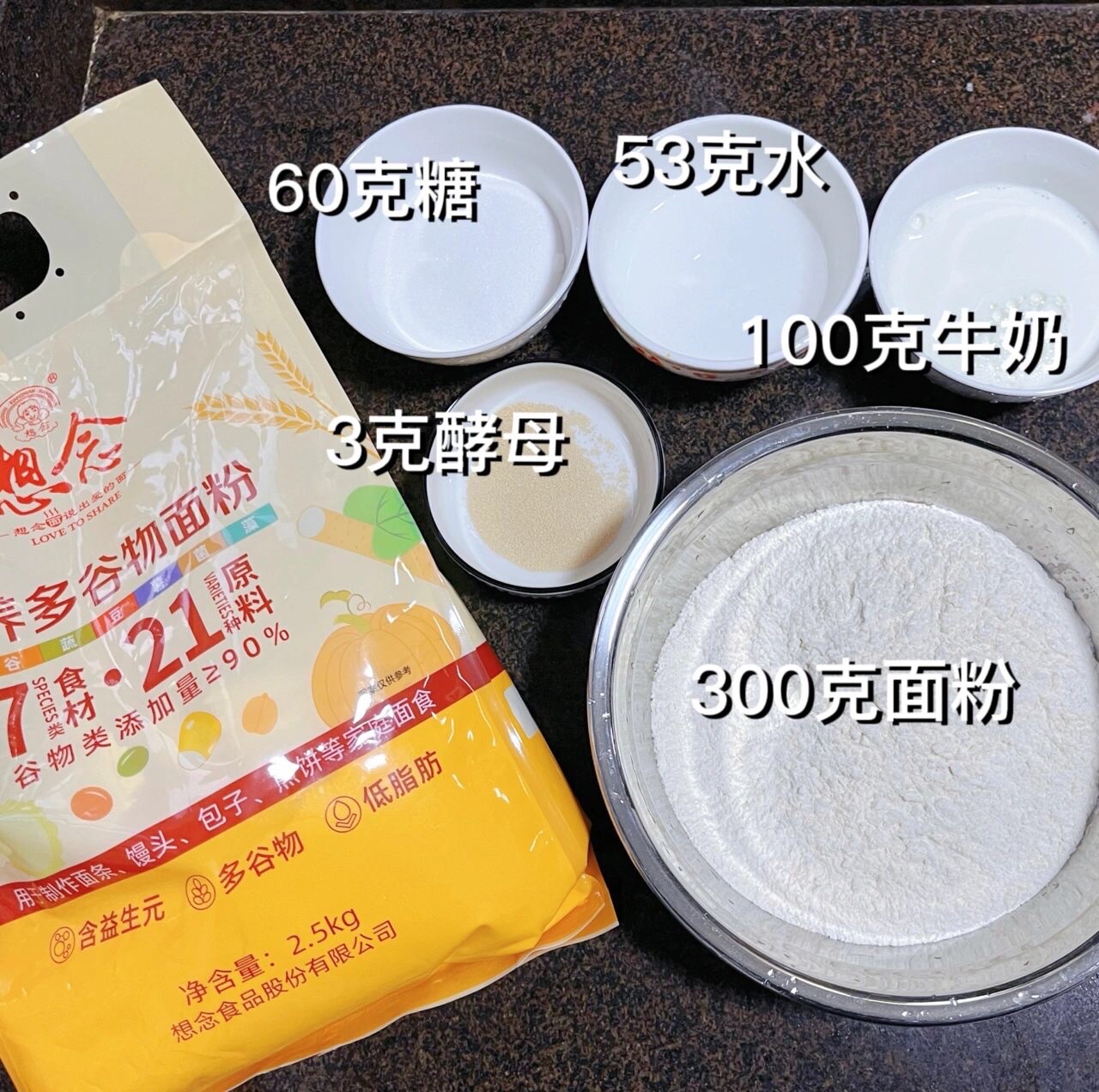 材料:面粉300克、纯牛奶100克、水53克、白砂糖60克(不喜欢甜的可以少放点糖)、酵母3克