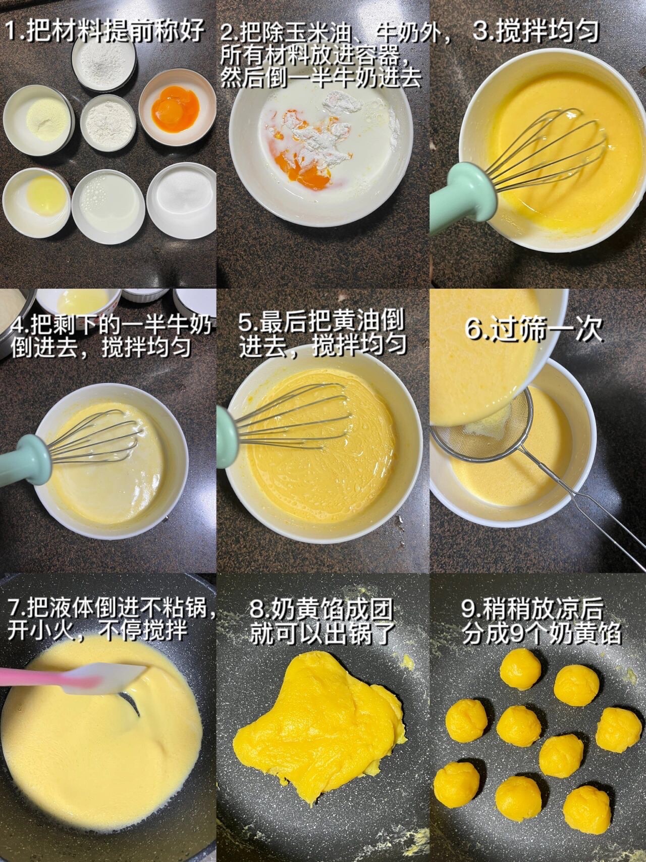 步骤4⃣️:把液体过筛一次,然后倒进不粘锅,开小火,不停地搅拌。奶黄馅成团就可以出锅了,稍稍放凉后分成9-10个奶黄馅。