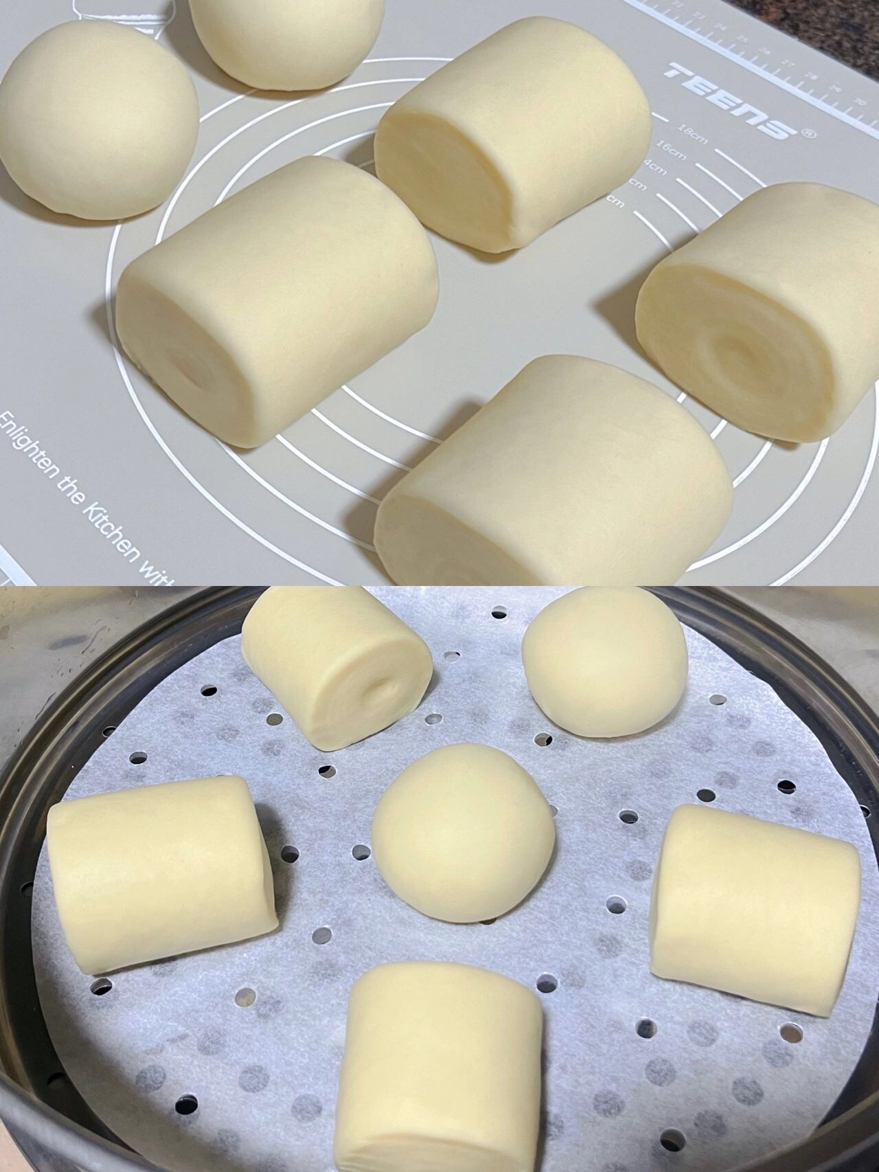 步骤5⃣️:面团揉好就把面团切开两半,分别用擀面杖擀成薄片,从上往下卷起来,切成小段,用手整理下馒头4个边角。