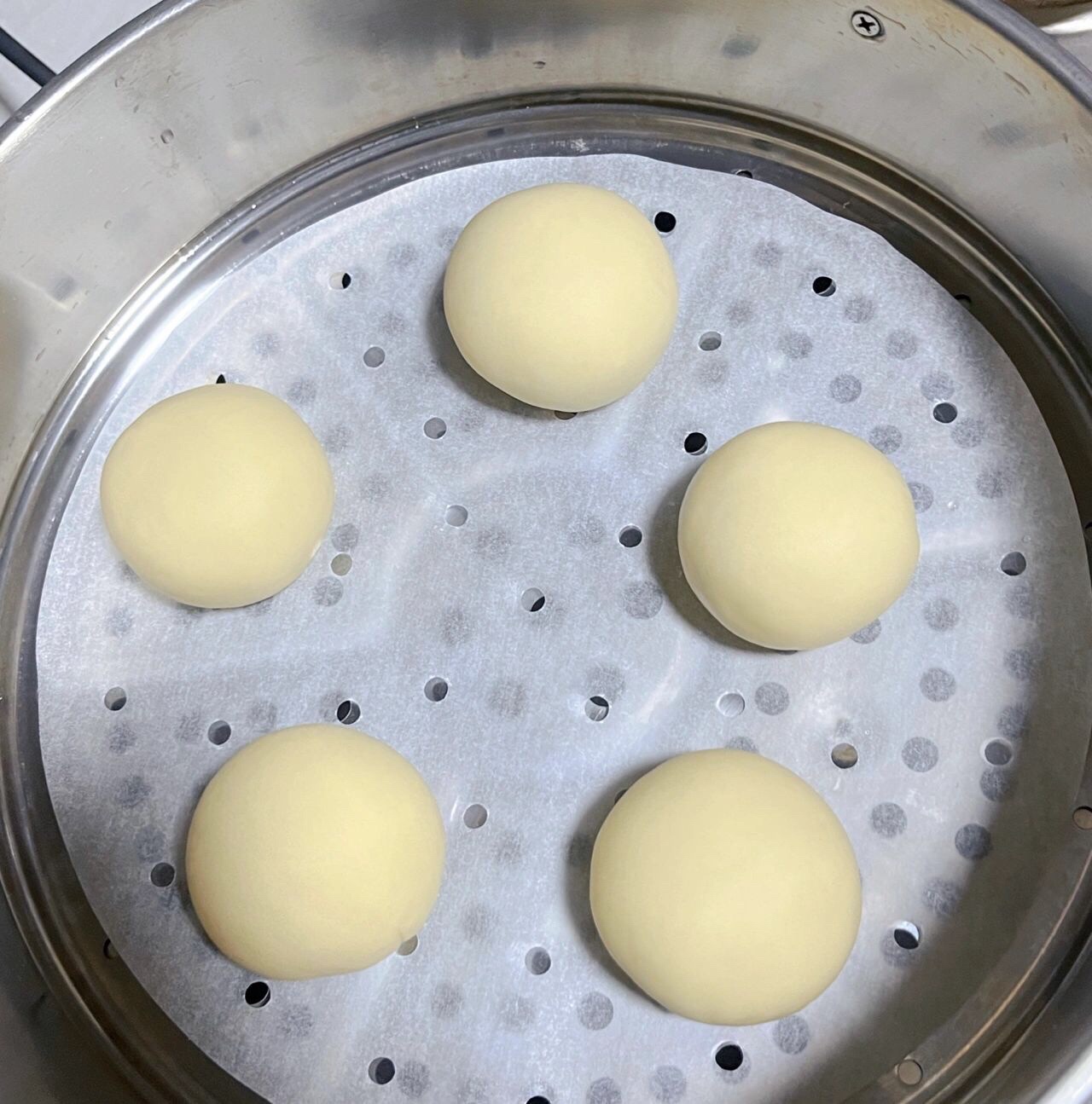 步骤6⃣️:做好的馒头放进蒸锅进行二次发酵(冬天比较冷,我都是锅里放温水发酵),时间是20分钟左右。