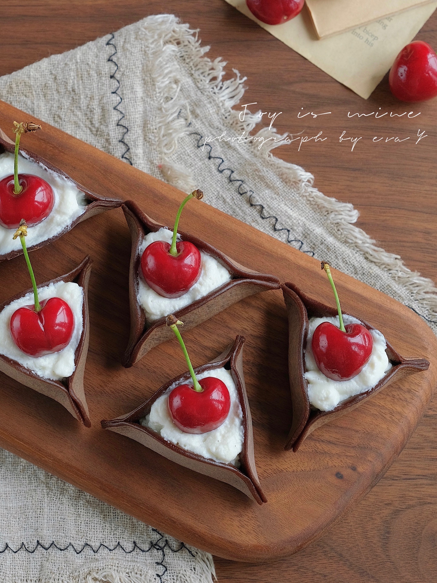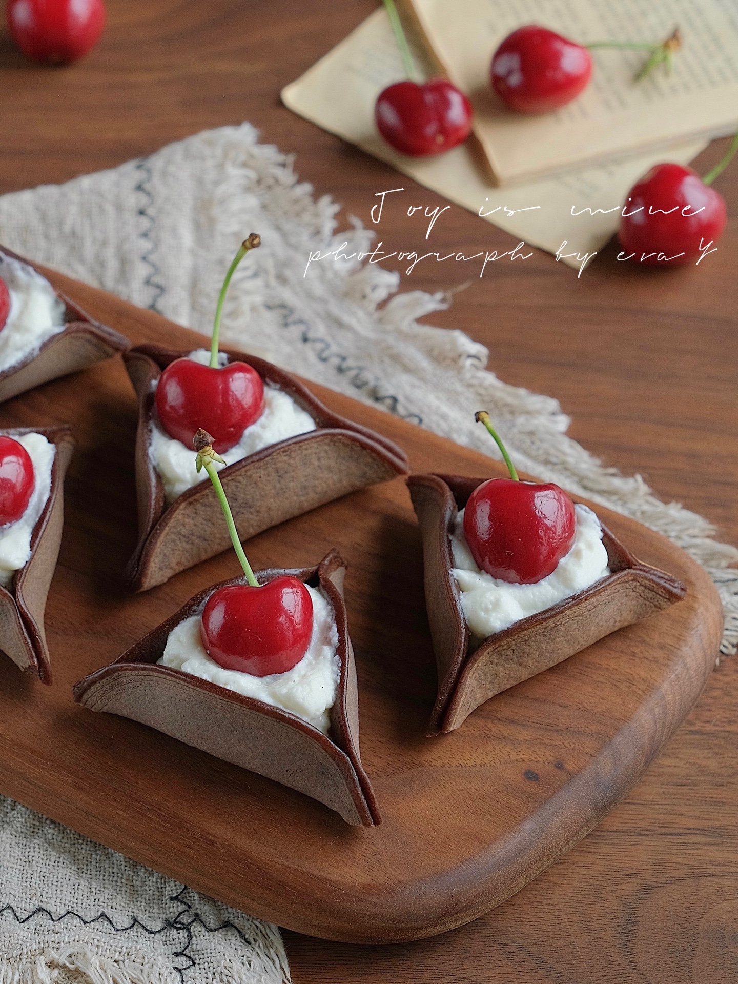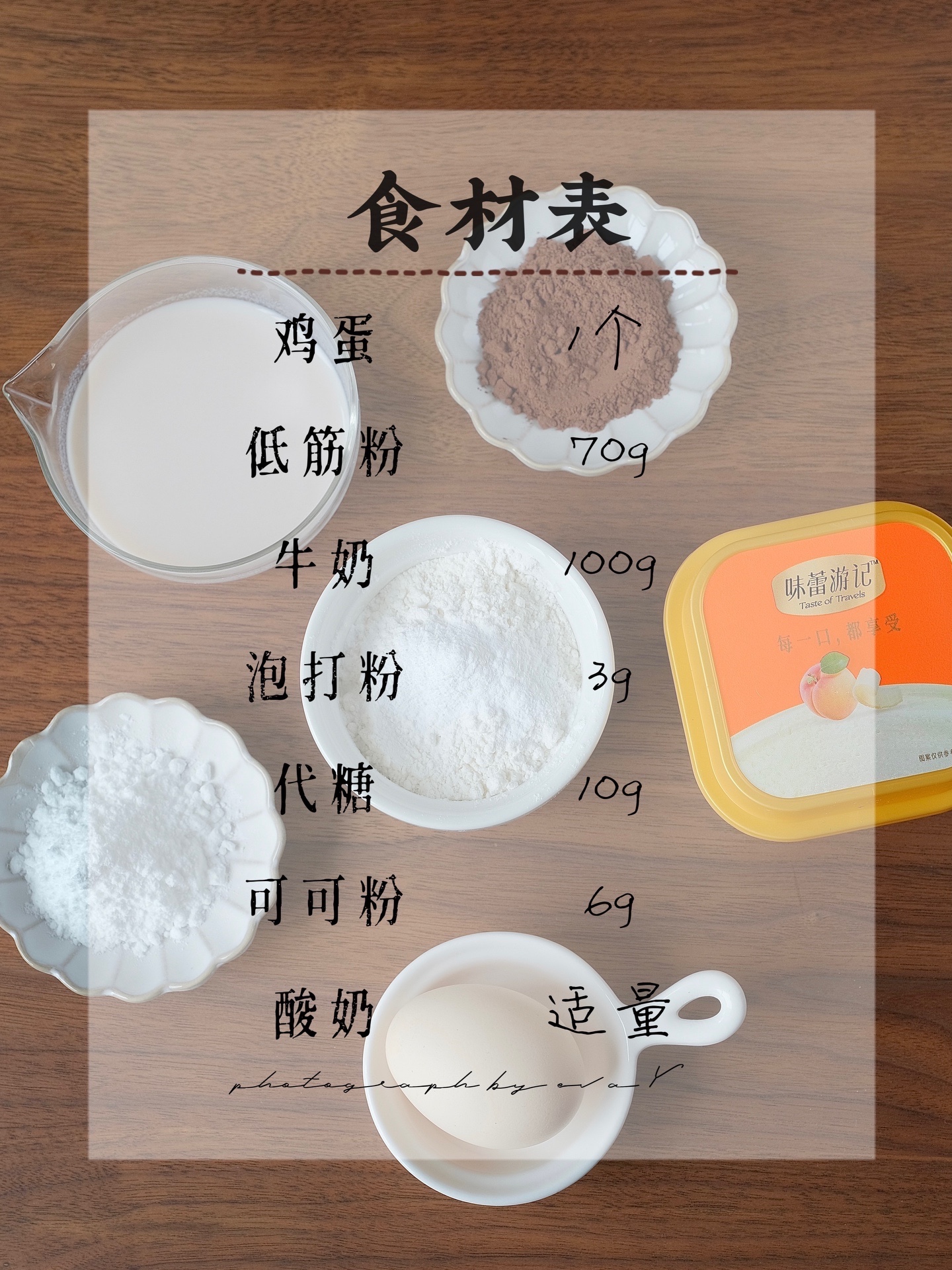 鸡蛋1个、低筋粉70g、牛奶100g、泡打粉3g、代糖10g、可可粉6g、酸奶适量、车厘子适量