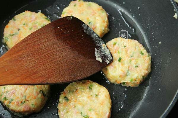 3、手里抹点油防止沾手,取适量土豆面团按扁成饼,锅内刷油,土豆泥小火煎至两面金黄即可。
