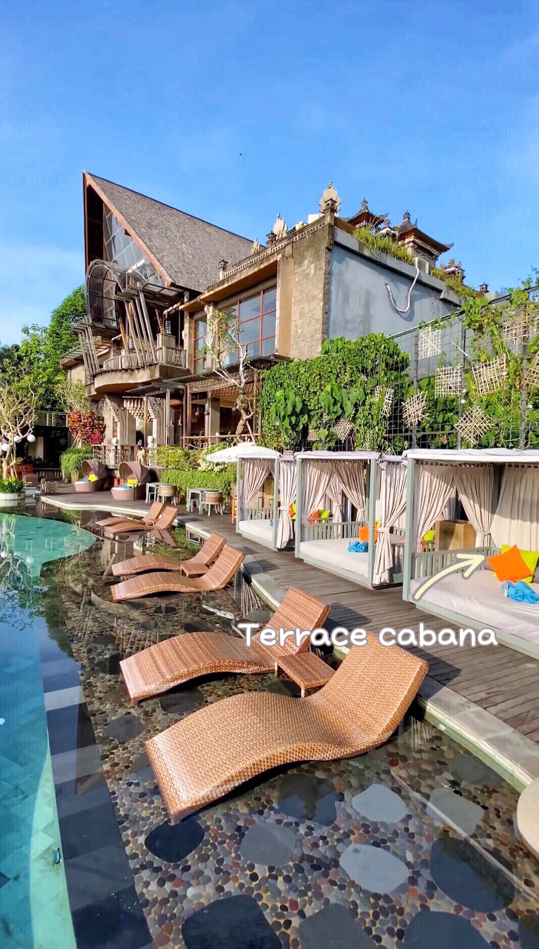 ✏️总结最佳游玩方式:上午10点前过来,带上泳衣,可以订一个泳池漂浮早餐,以梯田作为背景与无边泳池美美的拍照📷。最下面一层的圆形⭕️泳池是热水的浴缸,怕冷的小伙伴可以先体验这个。休息时,如果想躺在不被晒的地方,请提前预定Terrace Cabana(图5️⃣),如果想打卡秋千的小伙伴,可以选择泳池人多的时候玩。