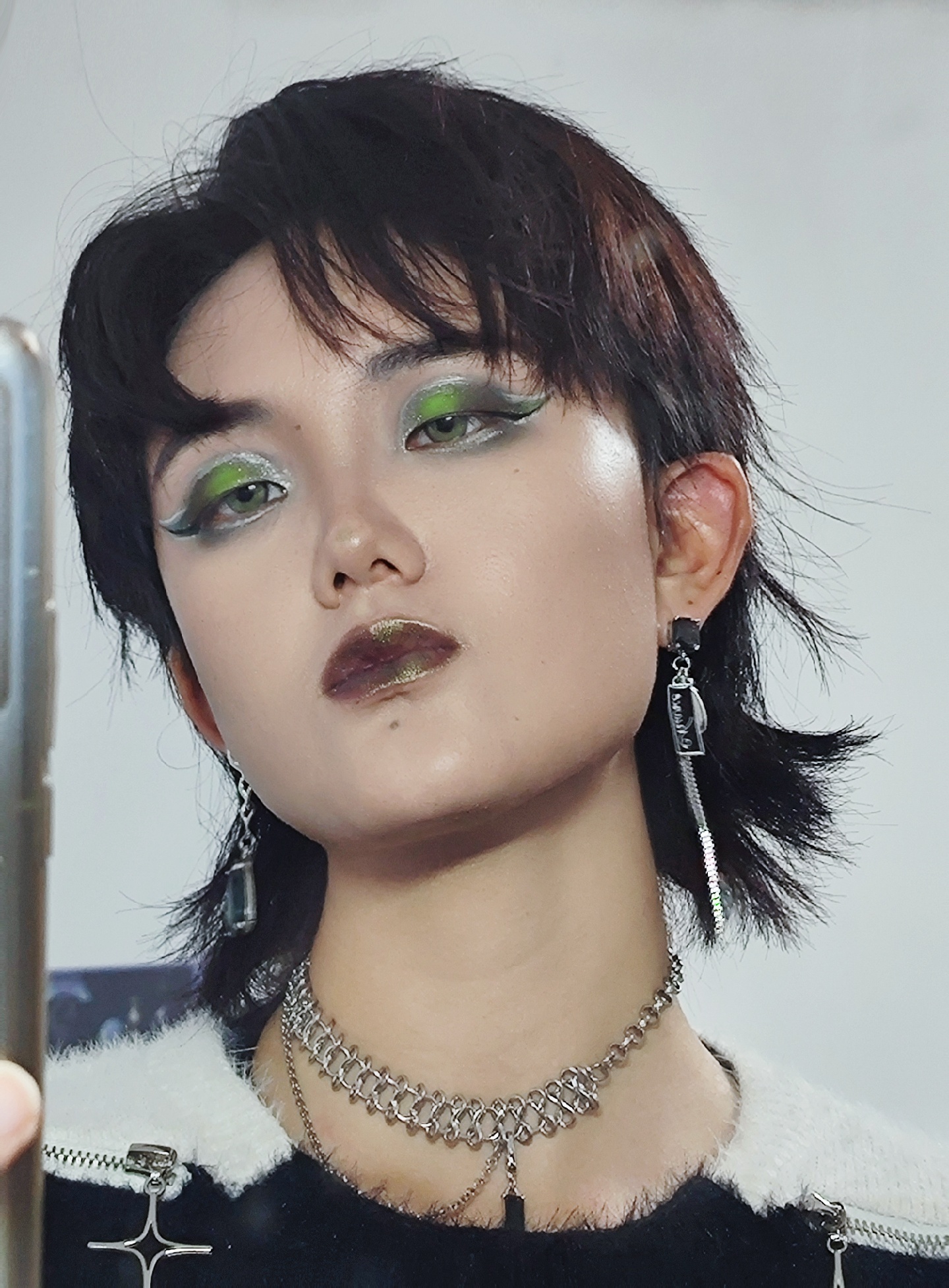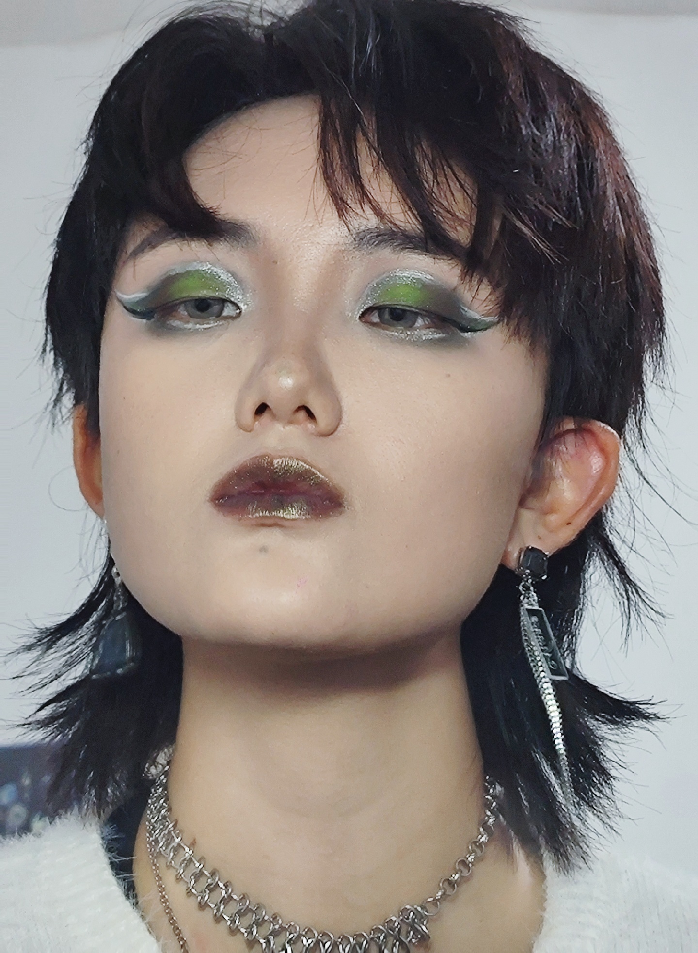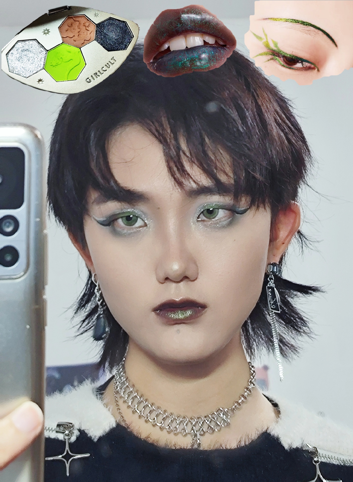用到的彩妆:Girlcult惹草眼影盘,流萤火口红,赛博绿眼线胶笔