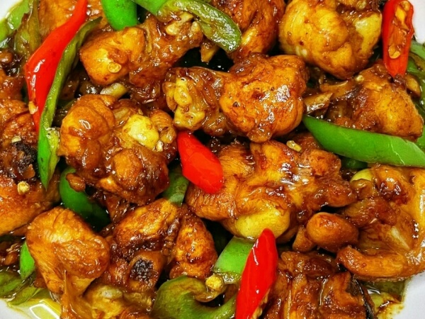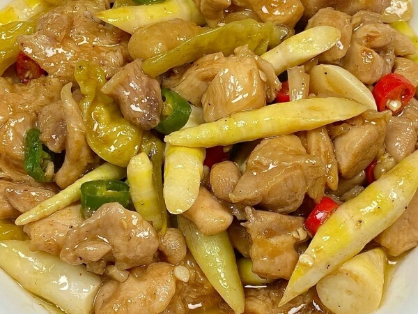 2、起锅烧油,油热后爆香蒜片,再放入鸡腿肉煸炒一会儿,炒至变色,炒至表面金黄。再放入酸笋、小米辣、青线椒和泡椒翻炒均匀。
