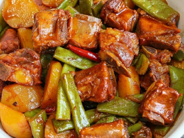 4、时间到,再放入土豆和豆角翻炒均匀,焖煮15分钟。最后加入食盐调味即可出锅。