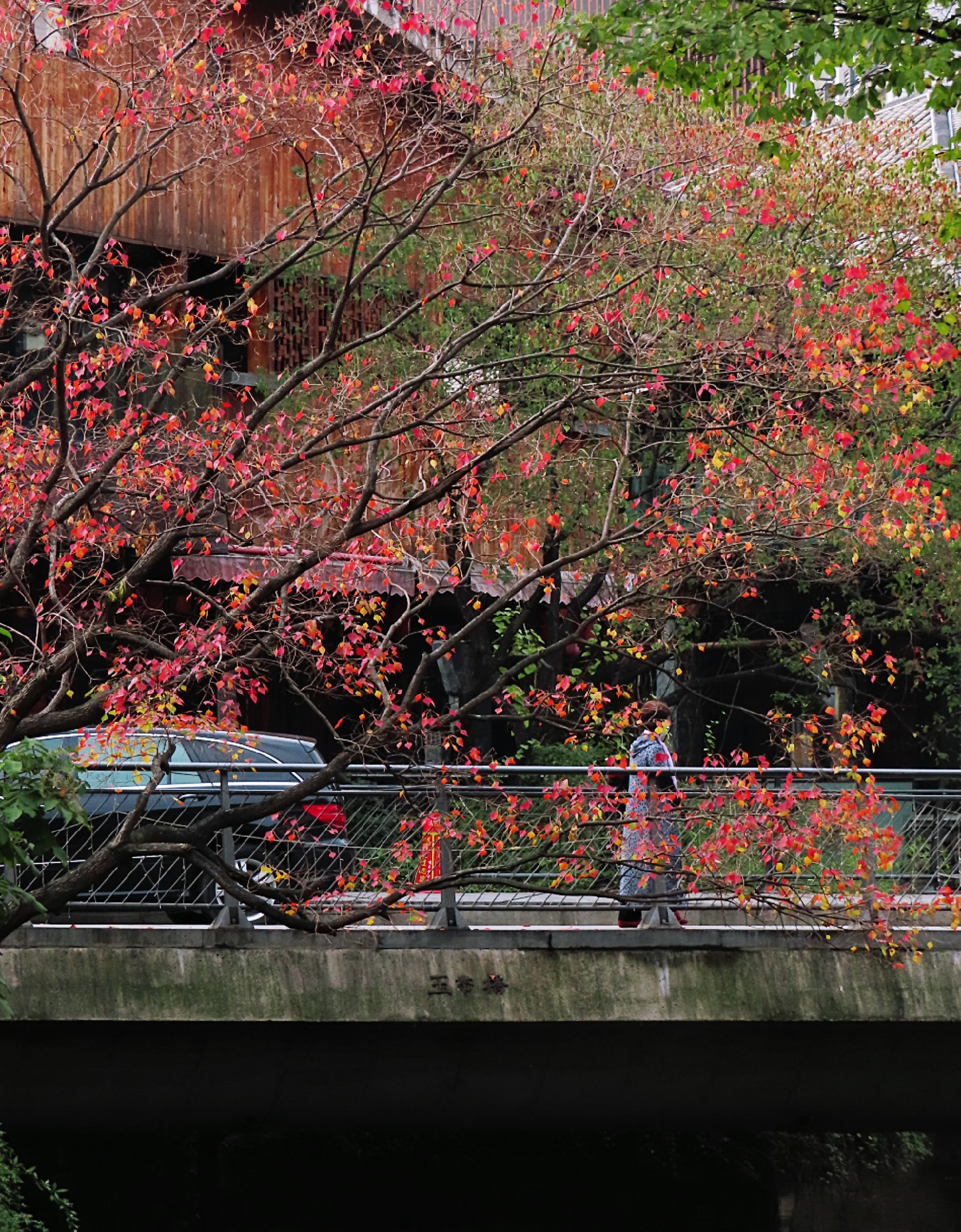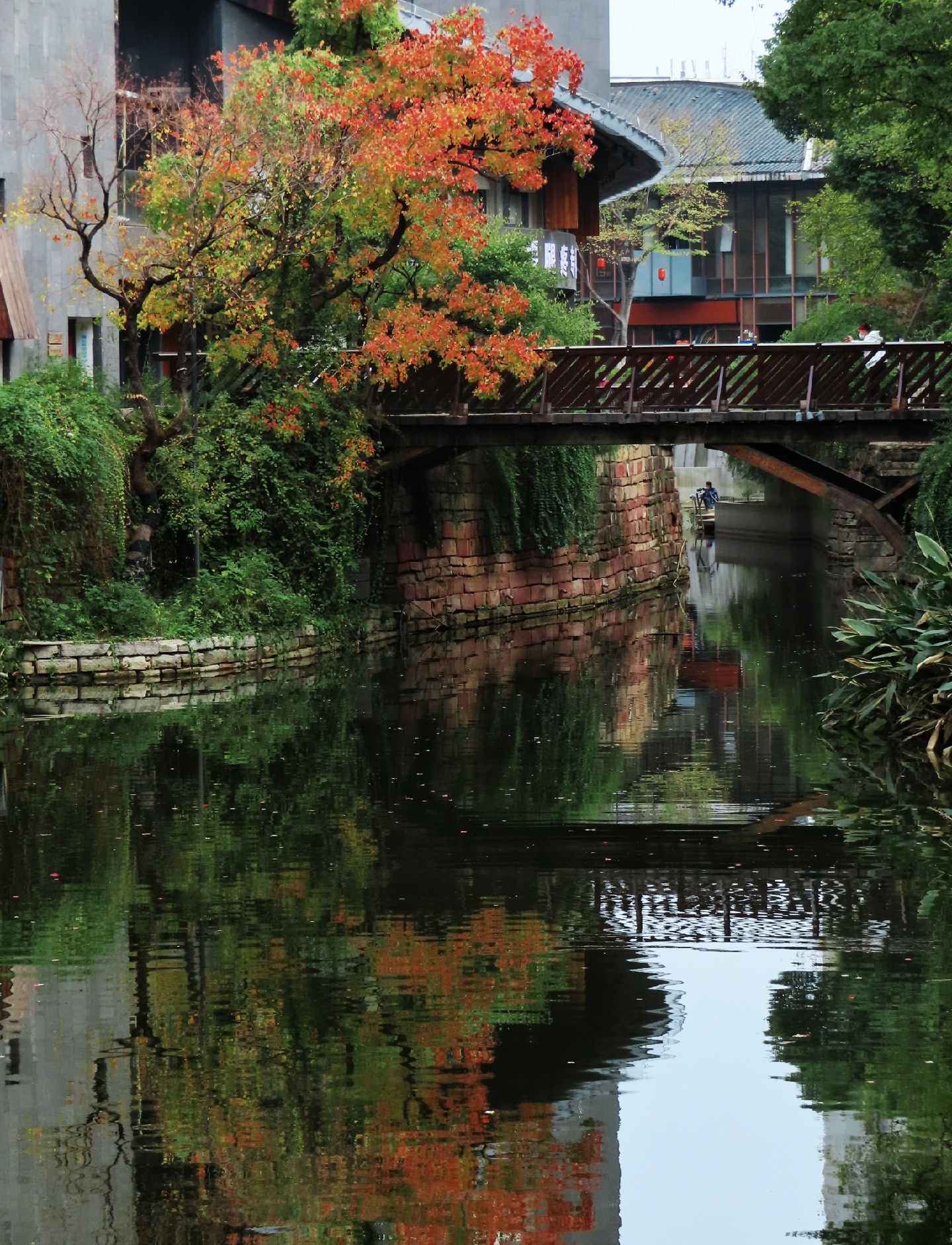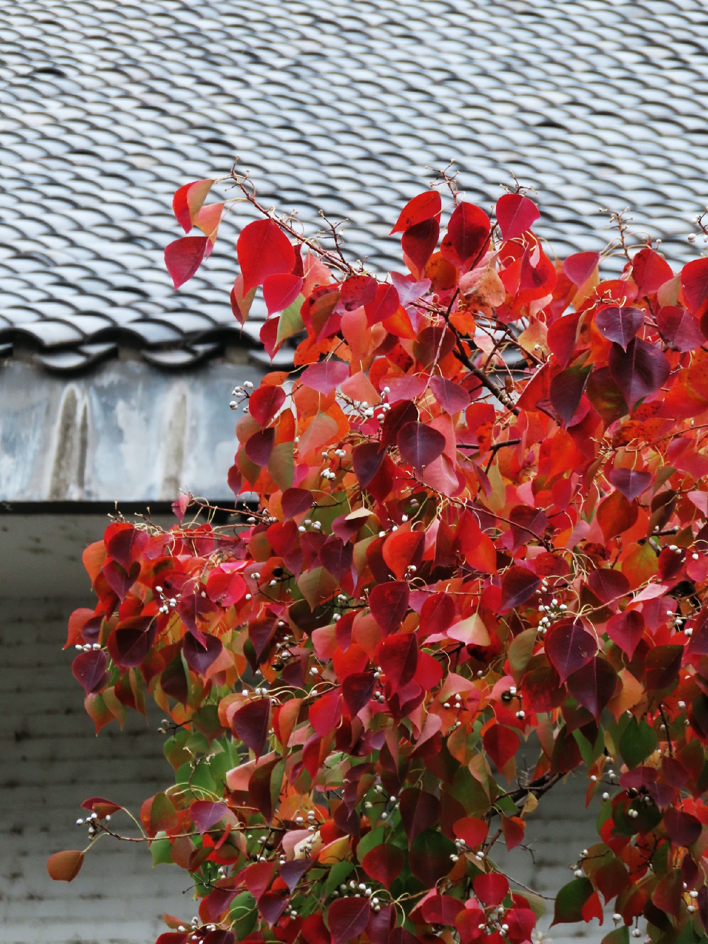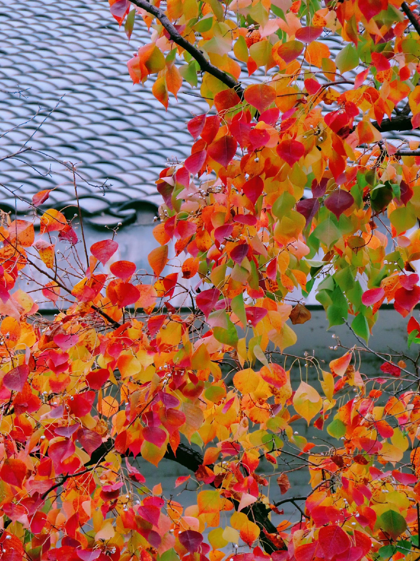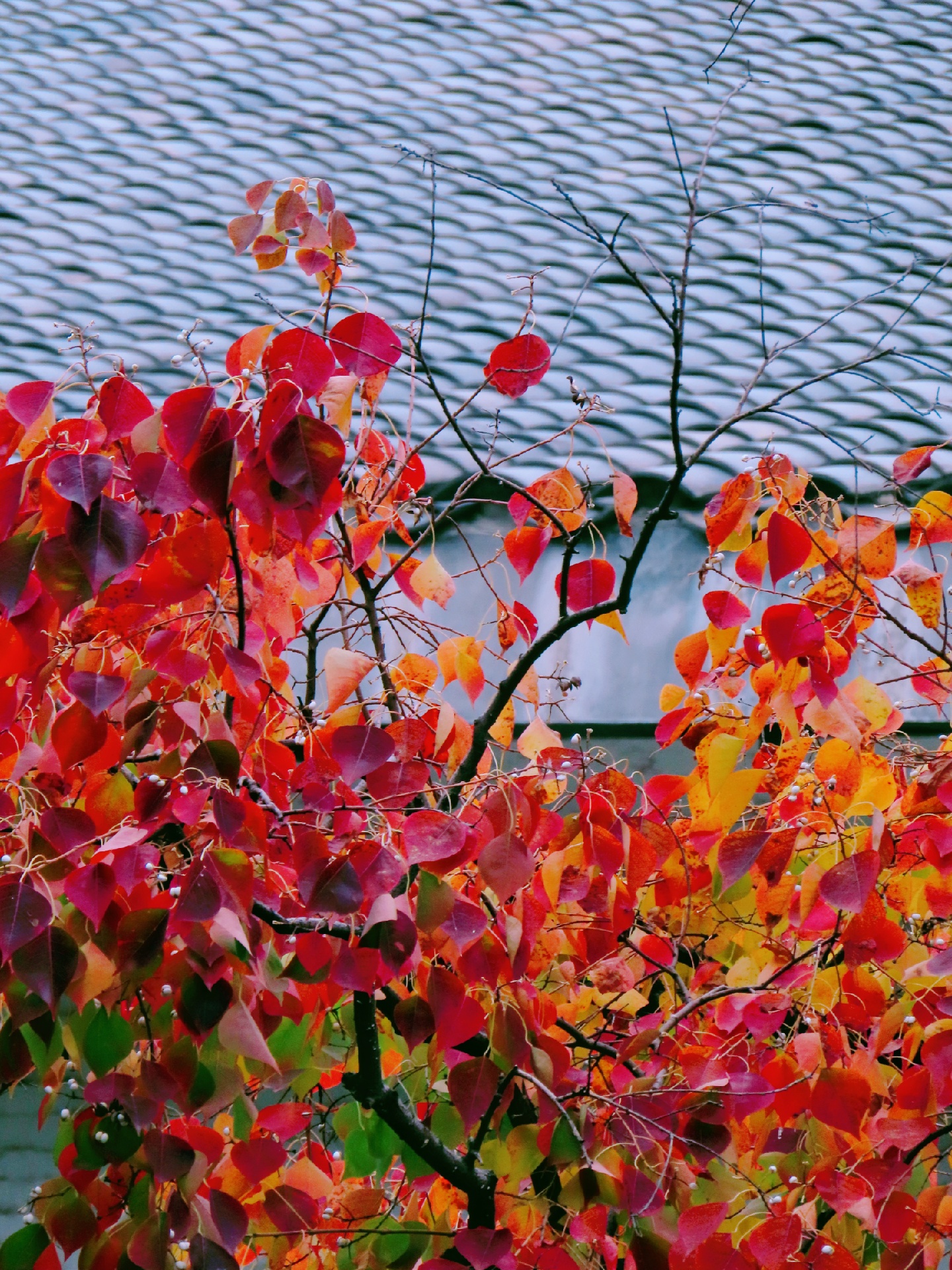 🥀在老西门内护城河东西两侧桥头,有两株高大的乌桕,远远望去,火红的树叶,自成一景,与白墙黛瓦构成了一幅秋末初冬的美丽画卷,引人驻足。