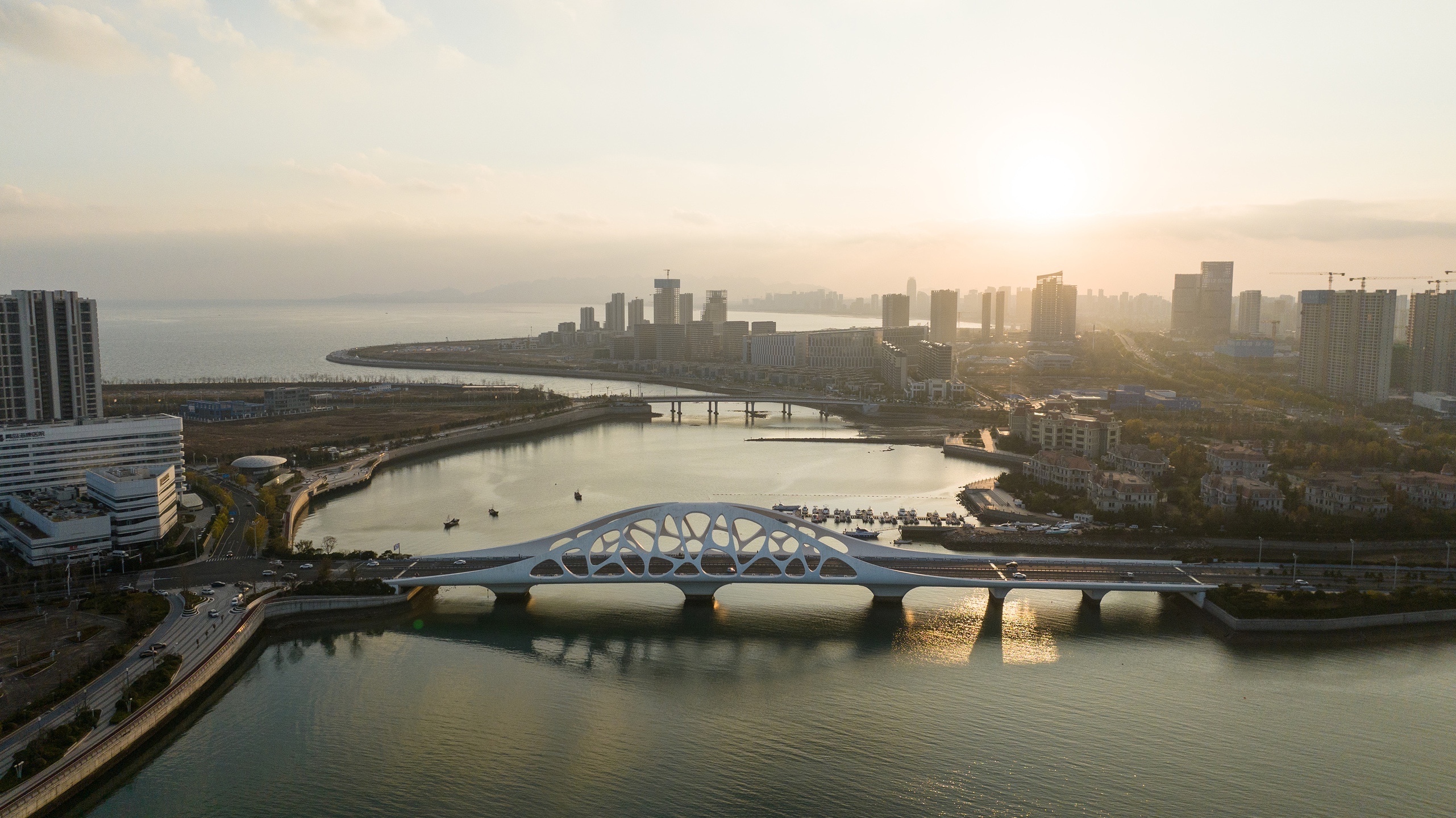 游走在珊瑚贝桥的人行道上,海风习习,沁人心脾。抬头仰望,只见珊瑚贝桥装饰拱如贝壳弧形成含珠之势,桥身的镂空纹理是对珊瑚外形进行了简约、抽象的艺术化勾勒,整体造型简约流畅、寓意深刻,成了青岛西海岸新区海滨一朵绽放的珊瑚贝,它充满了浪漫,让人神往。