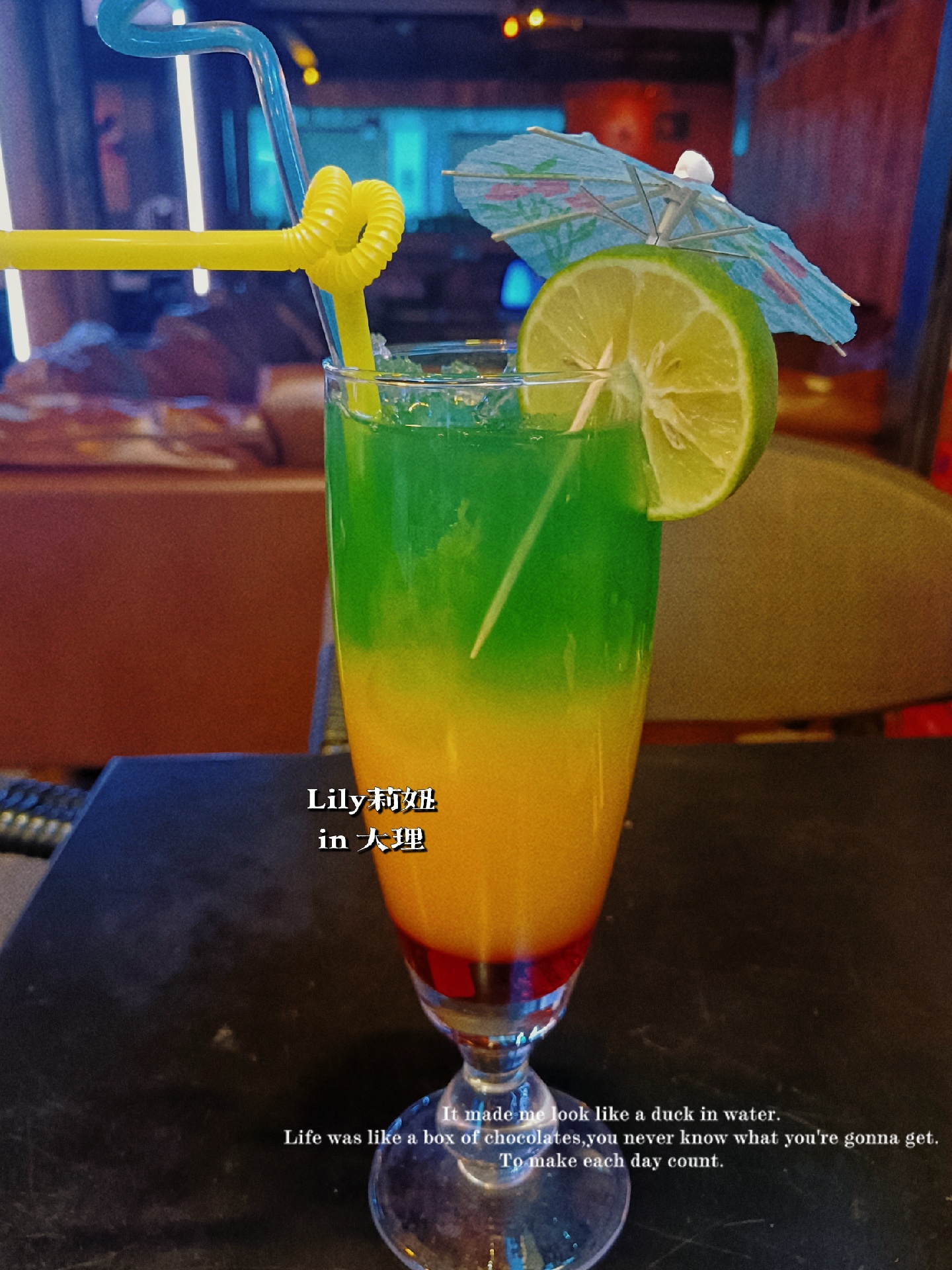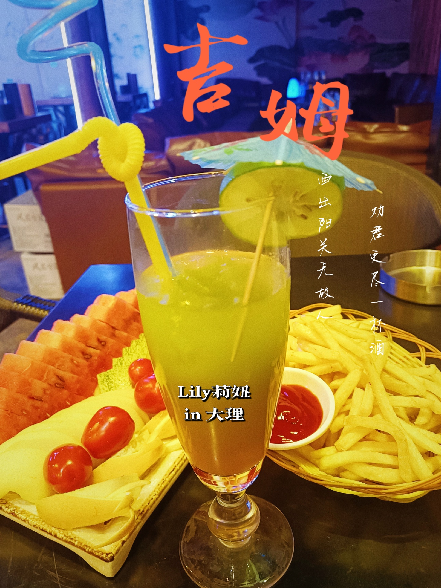 今晚调的两杯🍸,一杯蓝色夏威夷颜值爆棚,清新的蓝色和同样清新的口感很适合女孩子。另一杯叫“画”,名字特别有诗意,如彩虹一般多彩,石榴糖浆口感甜腻,但是搭配龙舌兰和芒果汁就中和了甜腻,口感特别好。佐酒的土豆条很香脆,小肉串肥瘦相间,香辣不腻。边撸串边品9边听着乐队倾情演唱的《再见杰克》,一个惬意的夜晚就此开始!