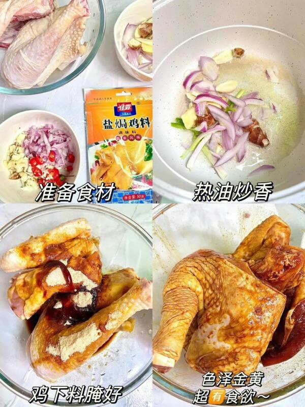 1、姜葱蒜和洋葱切好备用,起锅烧油5成油温爆出香味倒碗里,然后加入半勺生抽,半勺老抽,半勺生粉,最后加入1包的盐焗鸡粉。
