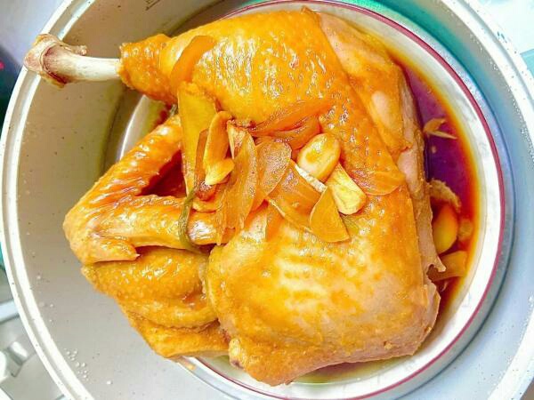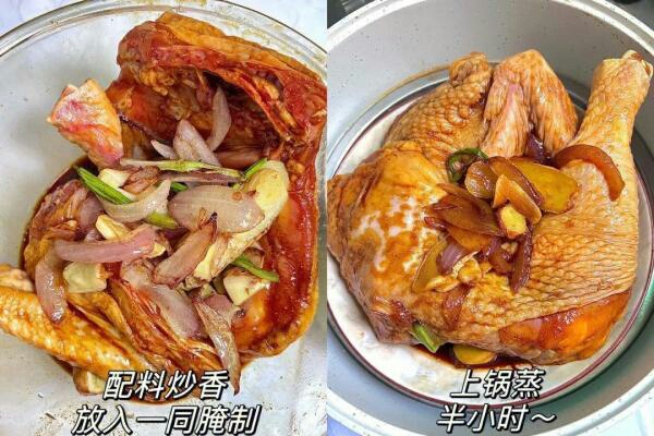 3、按摩完毕之火,把鸡放到锅里隔水清蒸30分就可以开吃了,可以当做手撕鸡,也可以把剩下的腌料当做酱汁蘸着吃。如果有烤箱的话,风味更佳,直接放到烤箱里180度烤25分钟即可,就更像是盐焗的风味了。