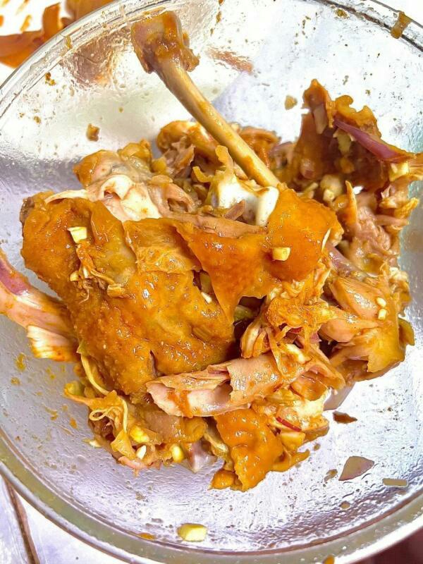 2、把一整只鸡或者鸡腿放进腌料碗里,反复揉搓按压,这一步十分关键,建议大家至少要按摩5分钟以上,也不用太用力,就是把这些香料的汁水和酱汁倒按压进鸡肉里。