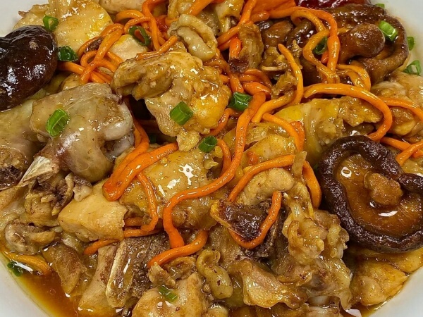 3、将鸡肉、干香菇和虫草花放入碗中,加入生抽、蚝油、淀粉和食用油,抓拌均匀腌制十分钟。