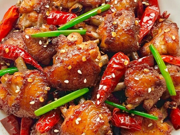 3、另起锅烧油,放入姜片、干辣椒、花椒爆炒出香味,再放入鸡中翅翻炒均匀入味。