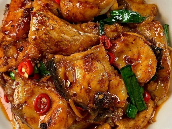 2、起锅烧油,油热后放入草鱼块煮一会儿,煎至表面金黄,就放入姜丝、小米辣、豆瓣酱、老干妈、蚝油、生抽、啤酒和适量清水没过食材,焖煮十分钟。