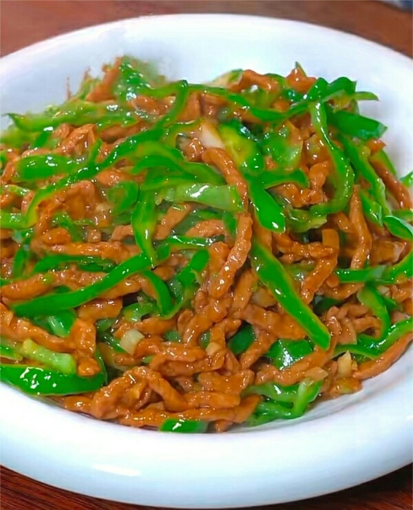 步骤三:另起锅烧油,放入蒜末炒香,再倒入青椒,加点盐,炒至断生,再放入里脊肉丝,加点生抽调味,翻炒均匀即可出锅。