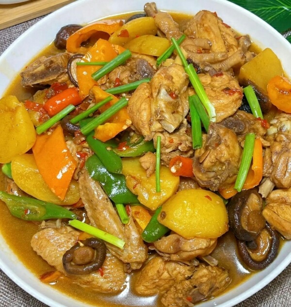 食材准备:鸡肉,土豆、青红椒、香菇、生姜、蒜、小米椒、冰糖、八角等。