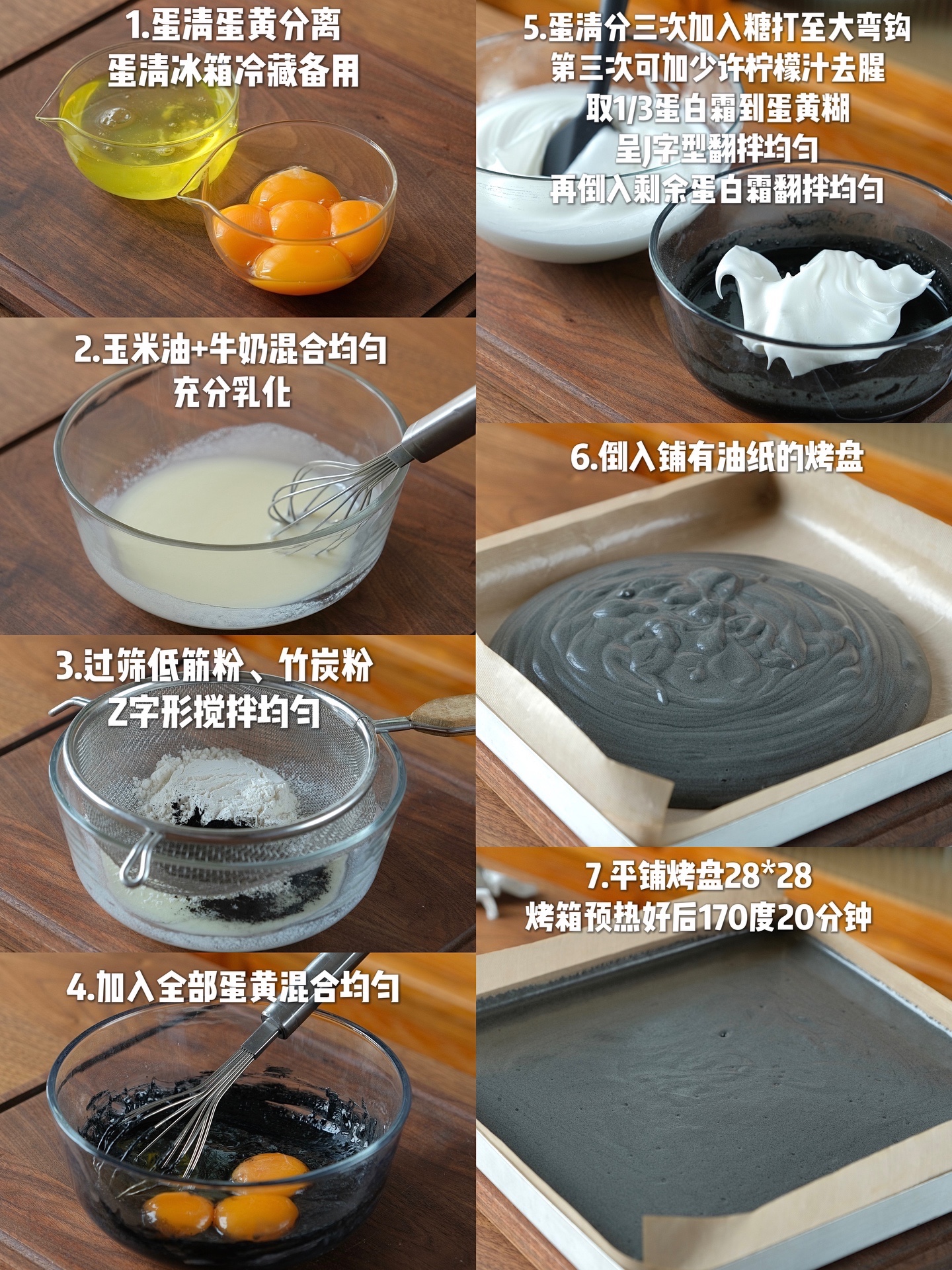 鸡蛋5个、玉米油50g、牛奶 50g、低筋粉55g、可食用竹炭粉5g、细砂糖50g