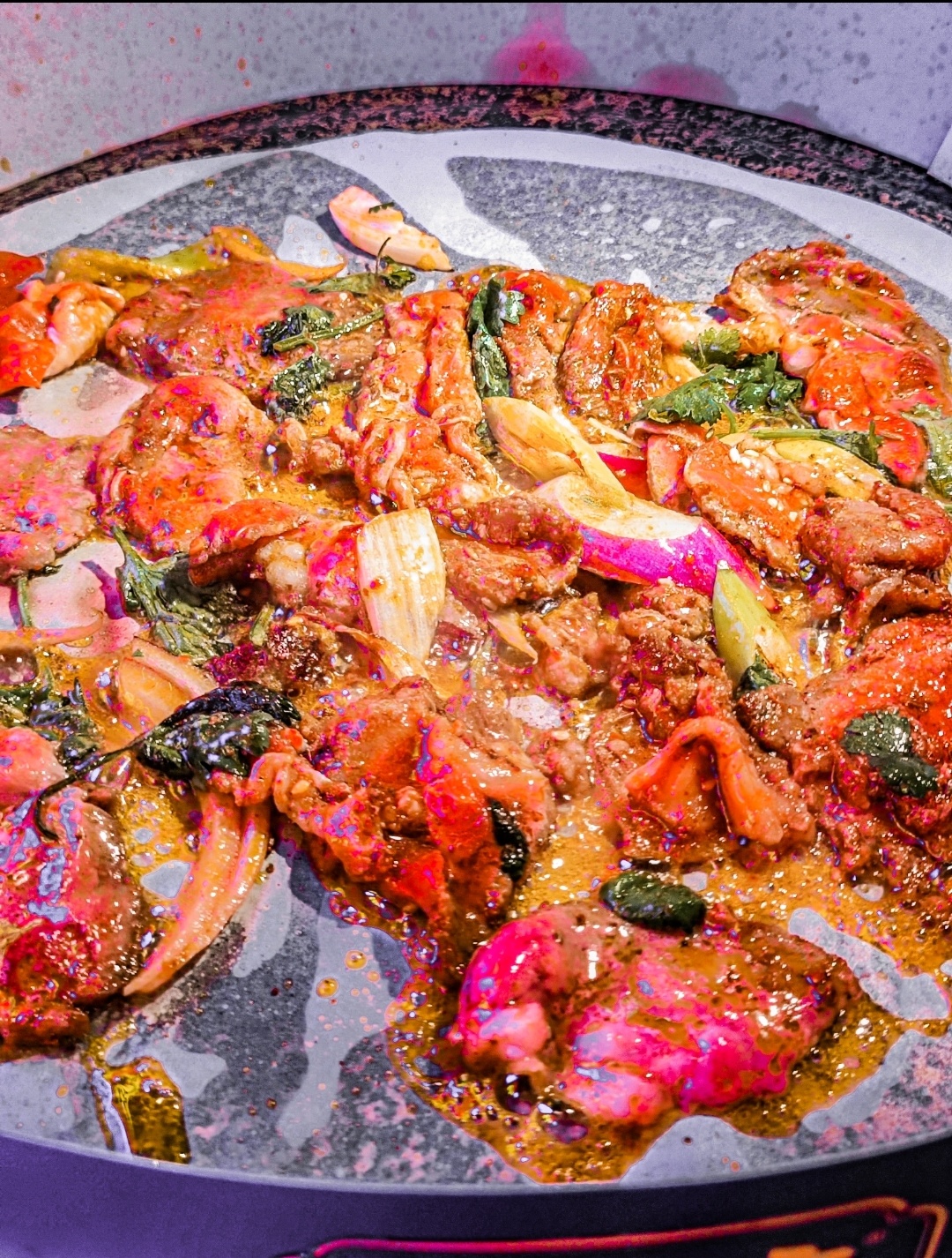 极品牛五花 连同上面的秘制调料一起放在铁板上烤,油脂从肉里激发出来在铁板上滋滋作响,裹进生菜里就上几片蒜味道超正~
