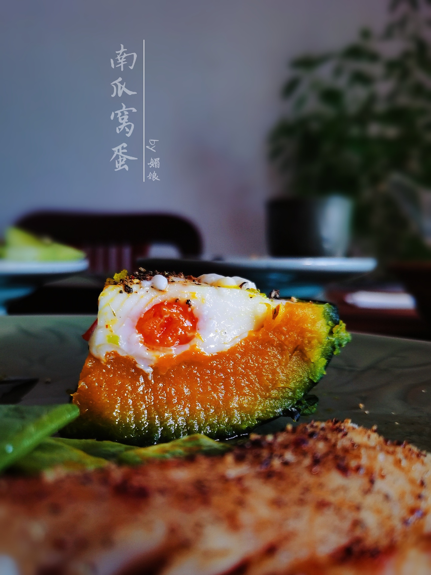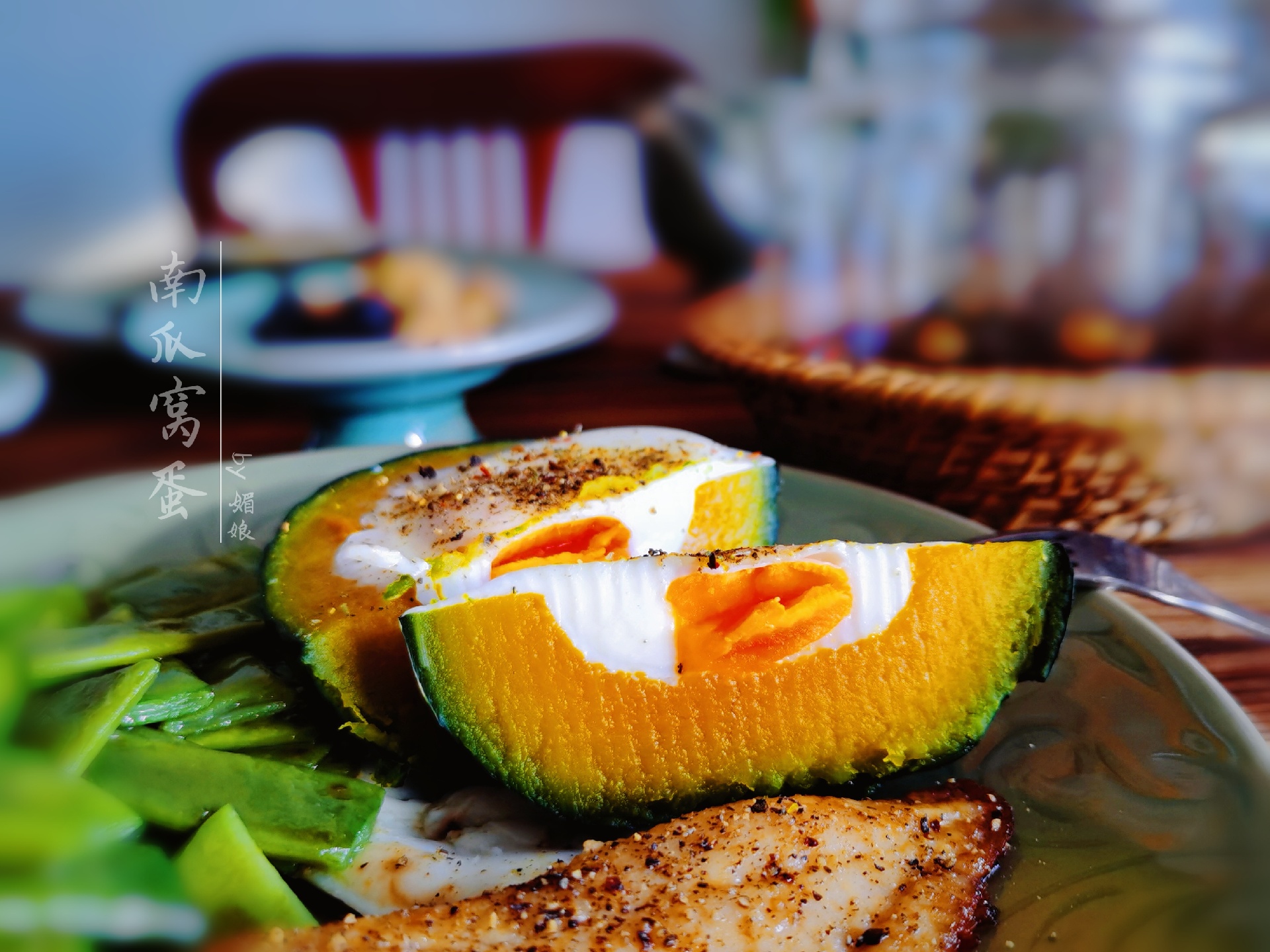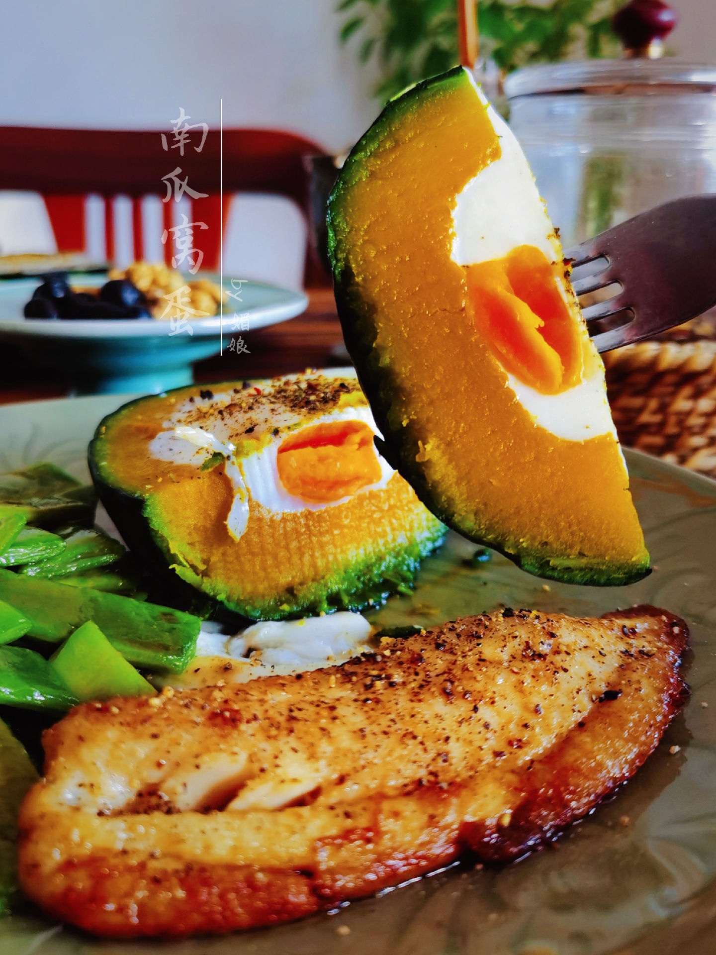 3、南瓜碗里各打入一个鸡蛋,盖回锅盖,中火蒸8分钟,关火焖3分钟