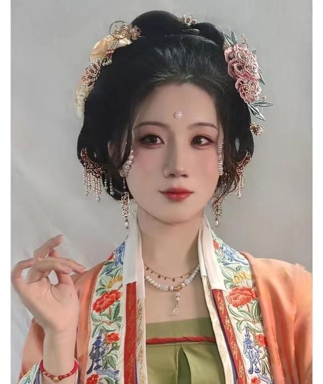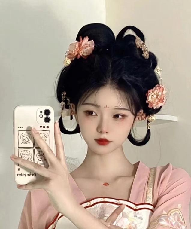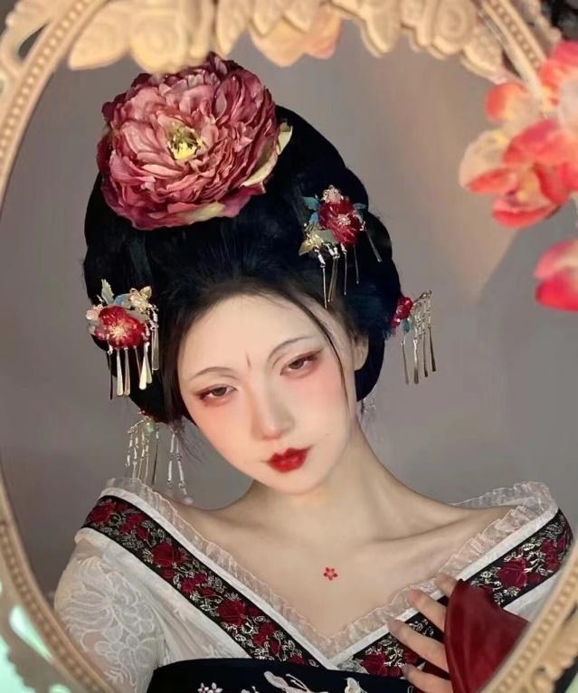 历朝历代之中,属唐朝发型发饰最显奢靡华丽,当时的妇女发型主要分为髻、鬟、鬓三类,其中以花髻最为流行,即在梳好的发髻上用鲜花装饰,李白也曾以“山花插宝髻”描绘花髻之美。