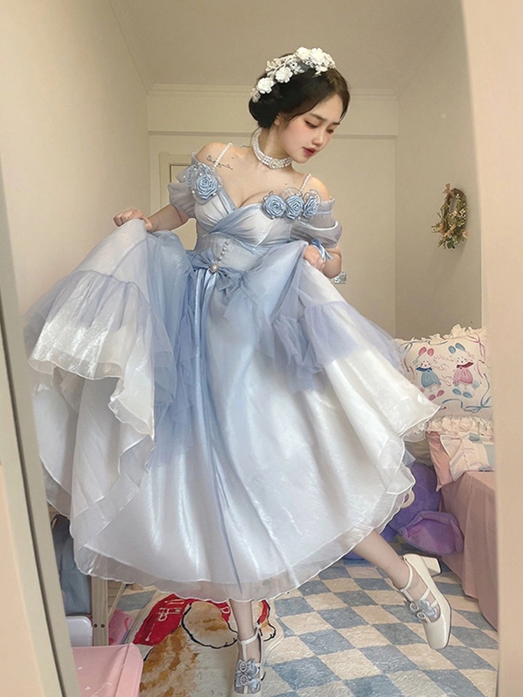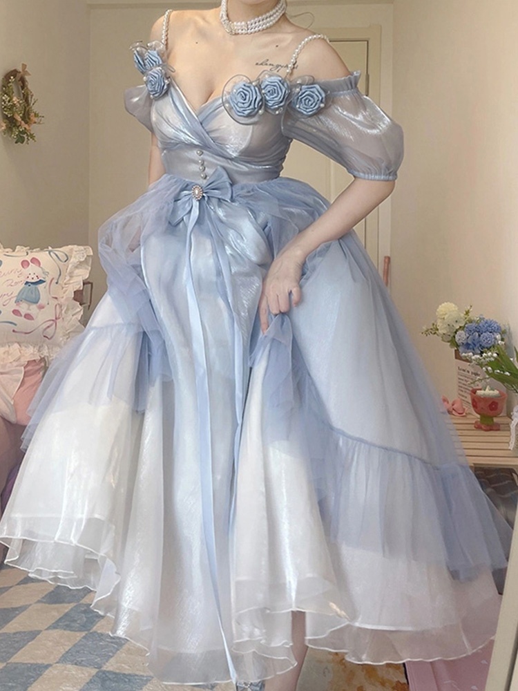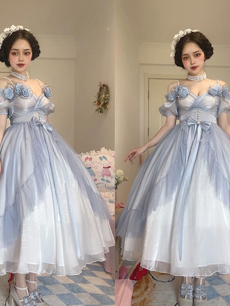 优雅渐变蓝礼服Lolita连衣裙女花嫁洛丽塔洋装轻lo玫瑰仙气公主裙