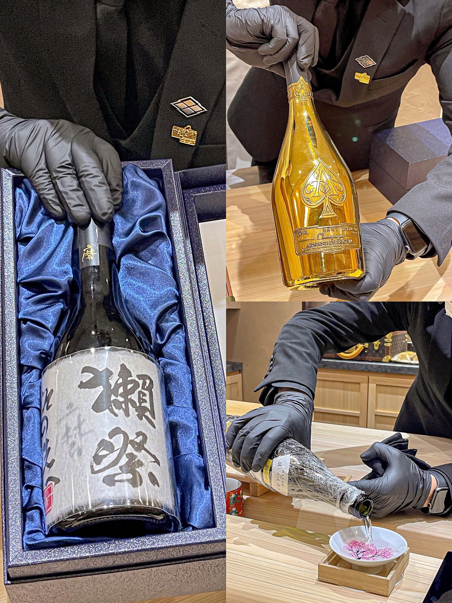 佐餐酒选用的是九屏次协田山田锦,盛酒的器皿都是变色的樱花树,喝上一口仿佛闻到了京都的樱花香