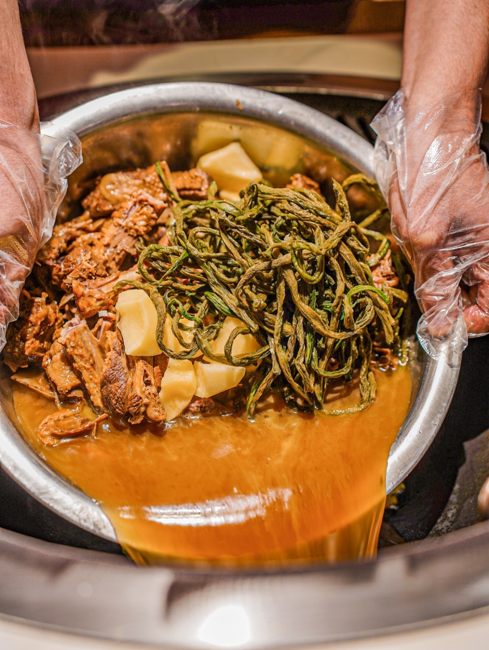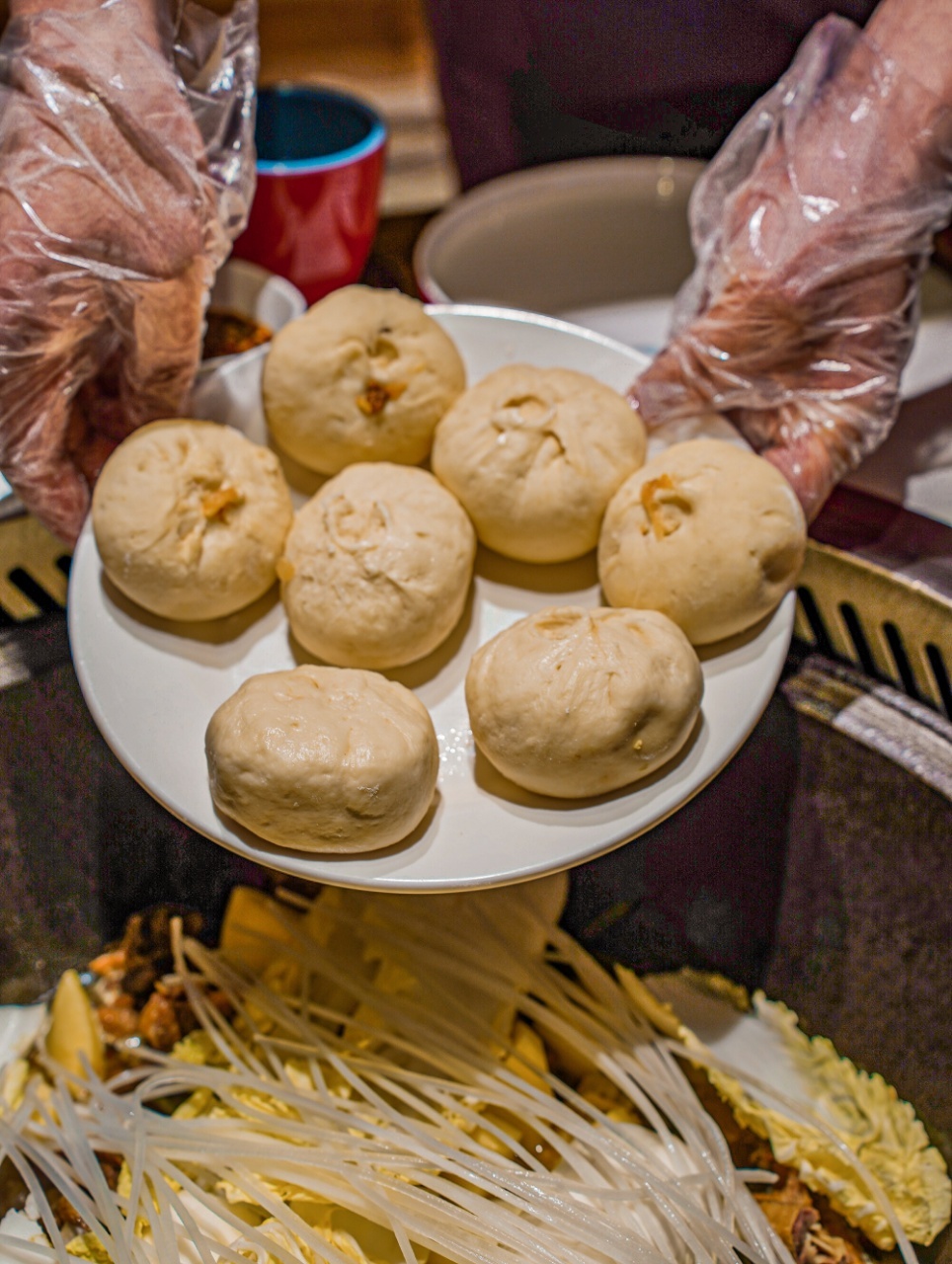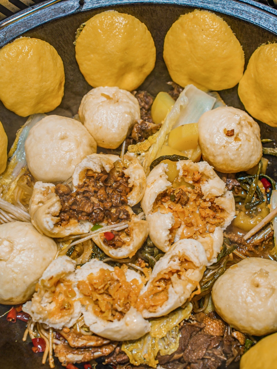 每桌都有个大铁锅,先用食用油爆炒一下葱姜蒜,再倒入一大盆的大鹅和配料,上面撒上白菜🥬,包子,米线,开始煮个十分钟左右,热腾腾的香味铺面而来,包子有白菜和肥肠馅料,吸满了大鹅的汤汁,吃起来真的是绝绝子,还有大块大块的鹅肉,原汁原味的,肉质紧实。边上烙玉米饼,玉米🌽味的香甜,蘸点大鹅的汤汁更入味。