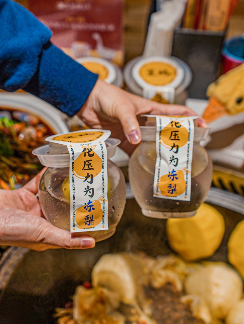 一个透明酒堂子的造型,里面是雪碧和柠檬皮,还有冻梨🍐,喝起来很清爽。冰冰凉凉的。