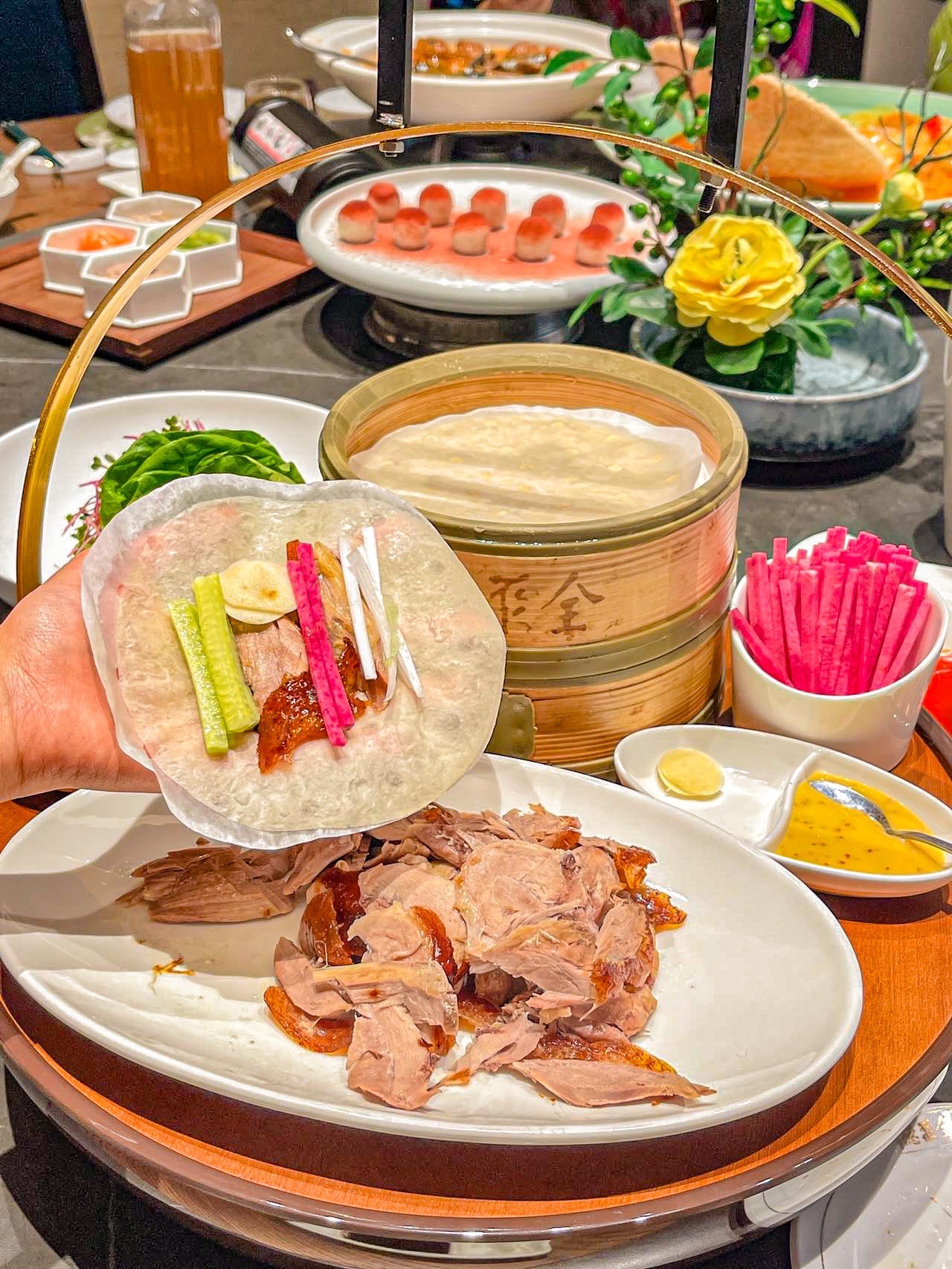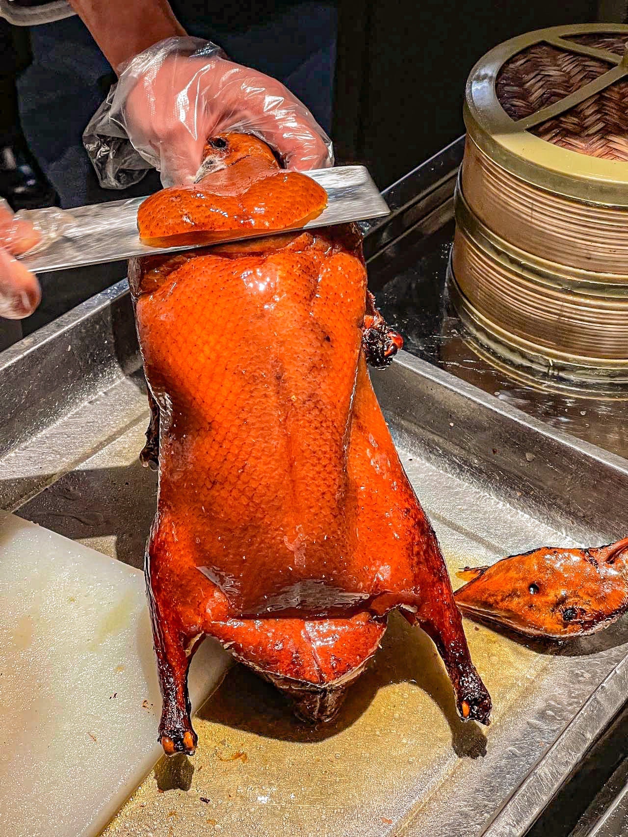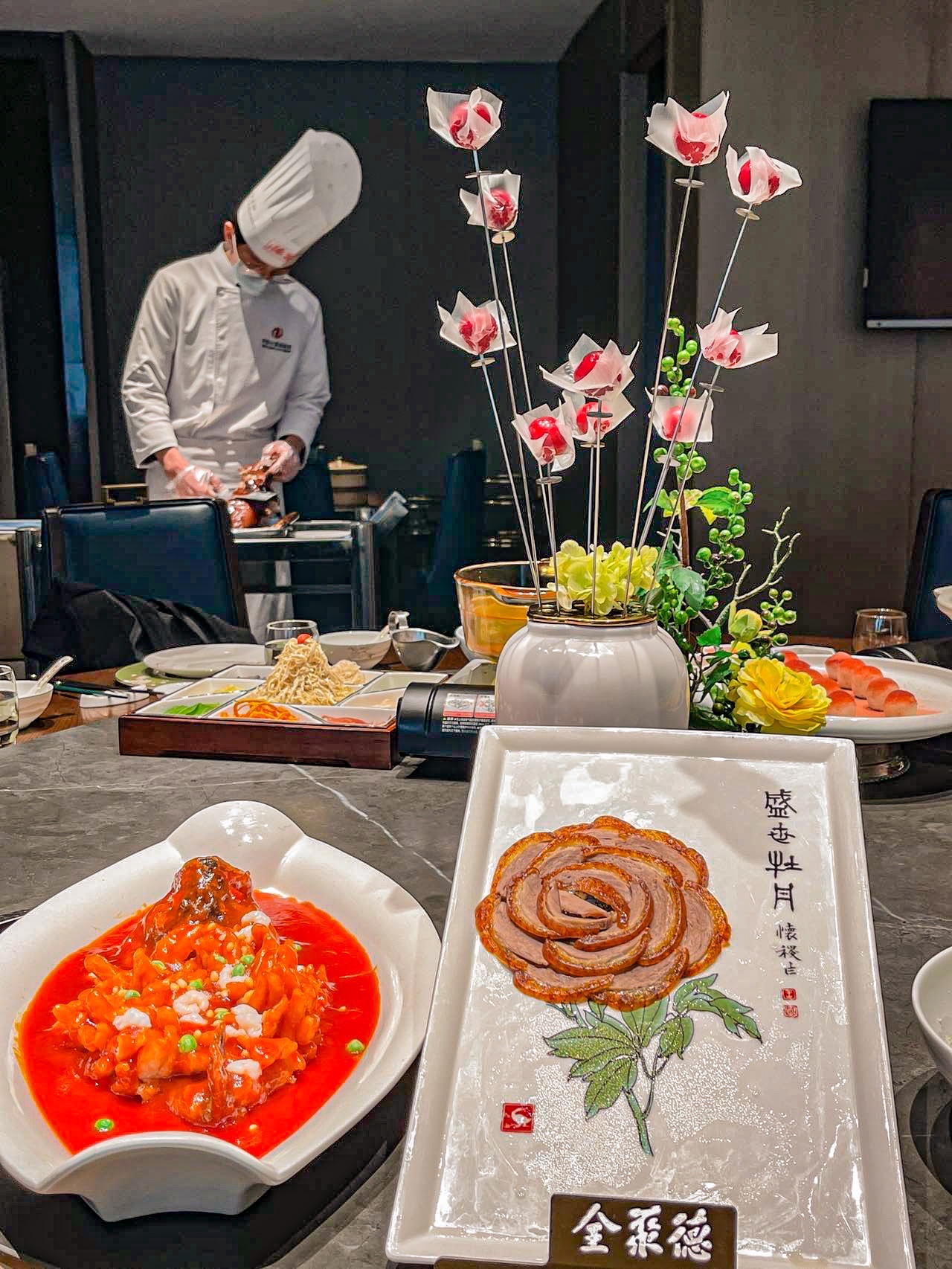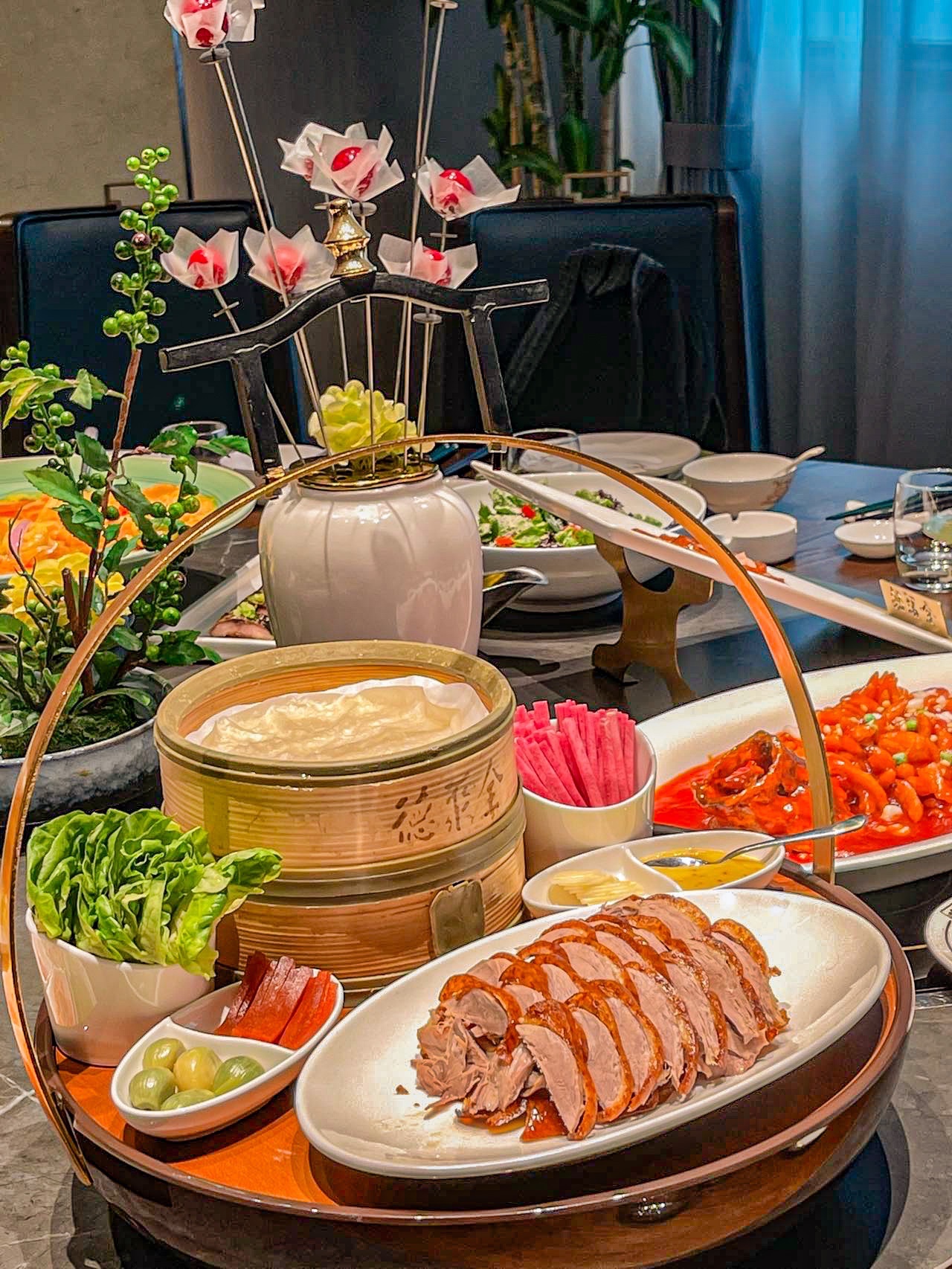 刀功了得的厨师将一整只烤鸭身上最优质的16片鸭肉,摆成一朵牡丹的大气造型,很有仪式感!