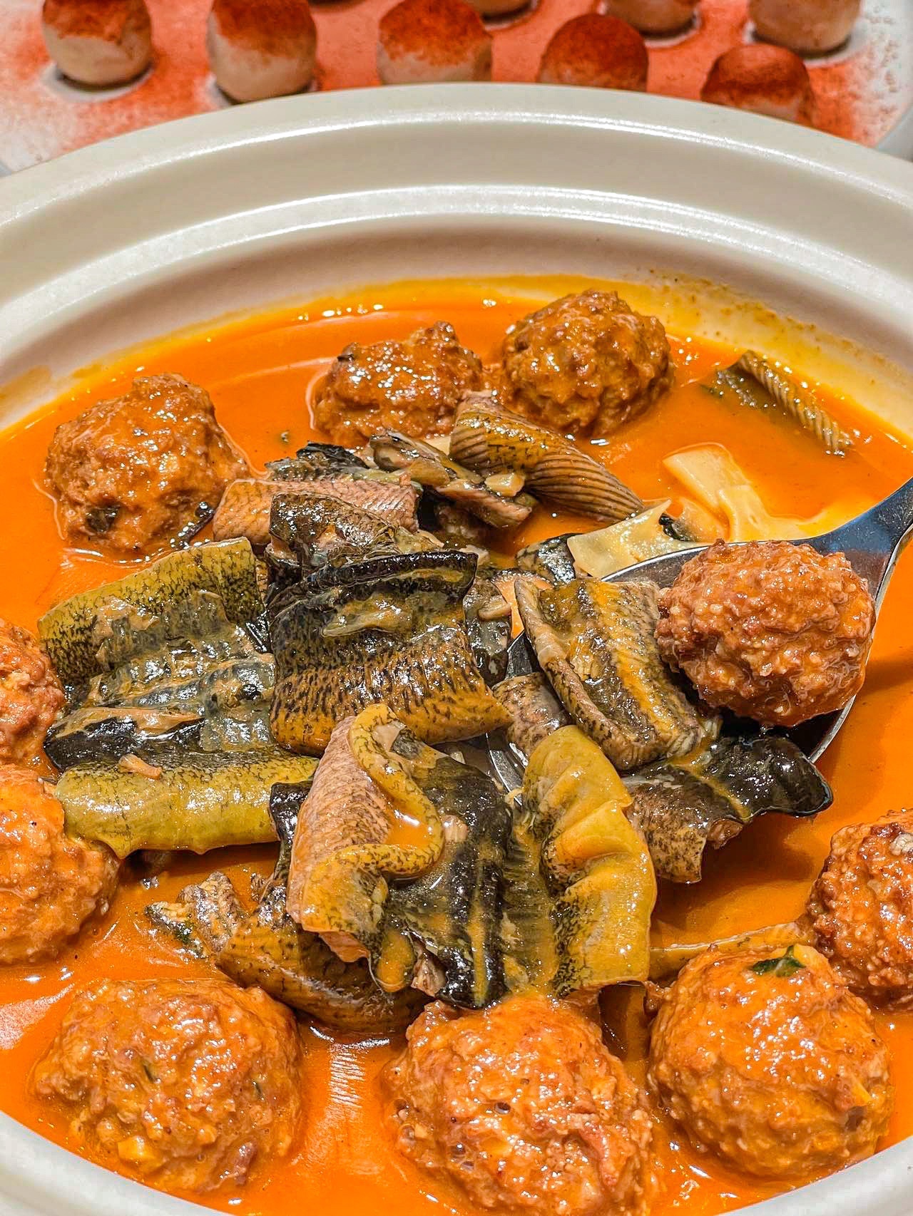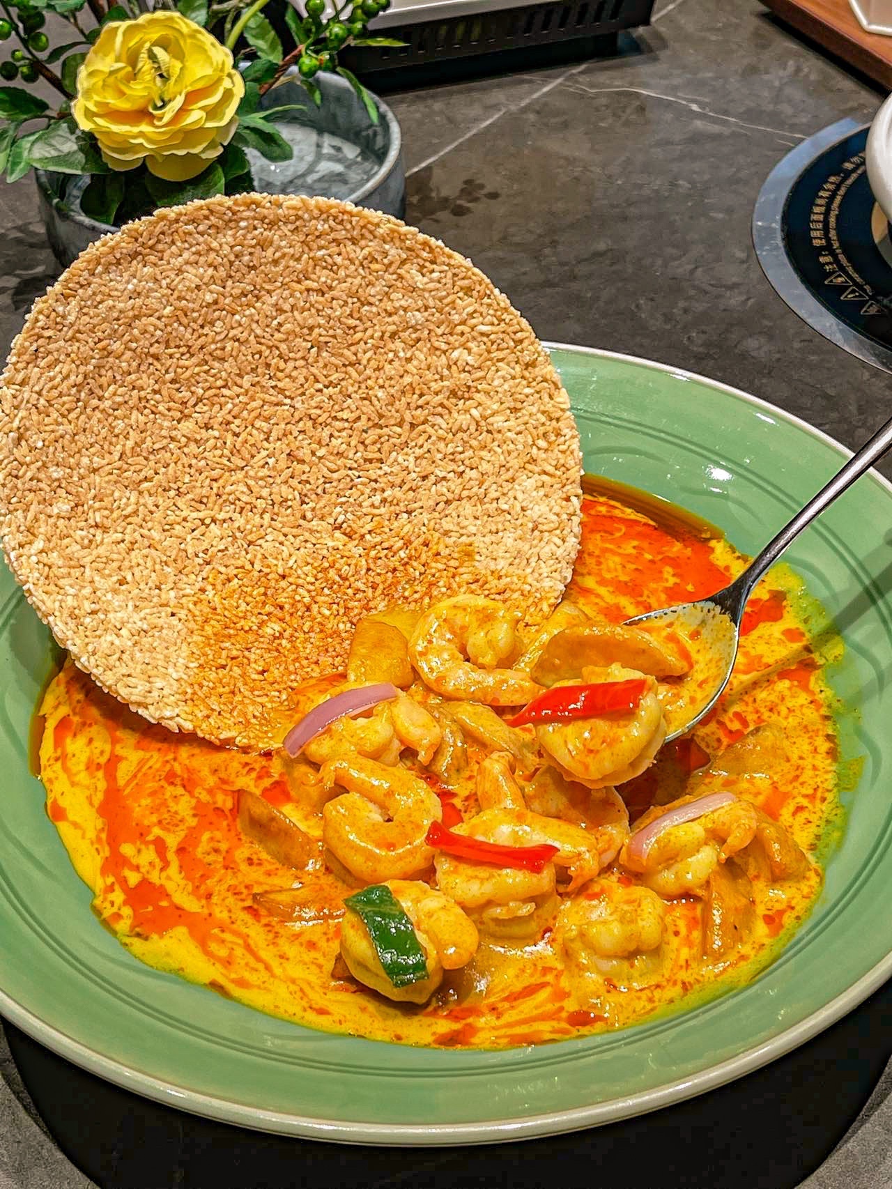 这个咖喱口味的虾球,肉质紧实Q弹,配上土豆还有一整个锅巴,敲碎了配着咖喱酱一起吃,香脆爽口!