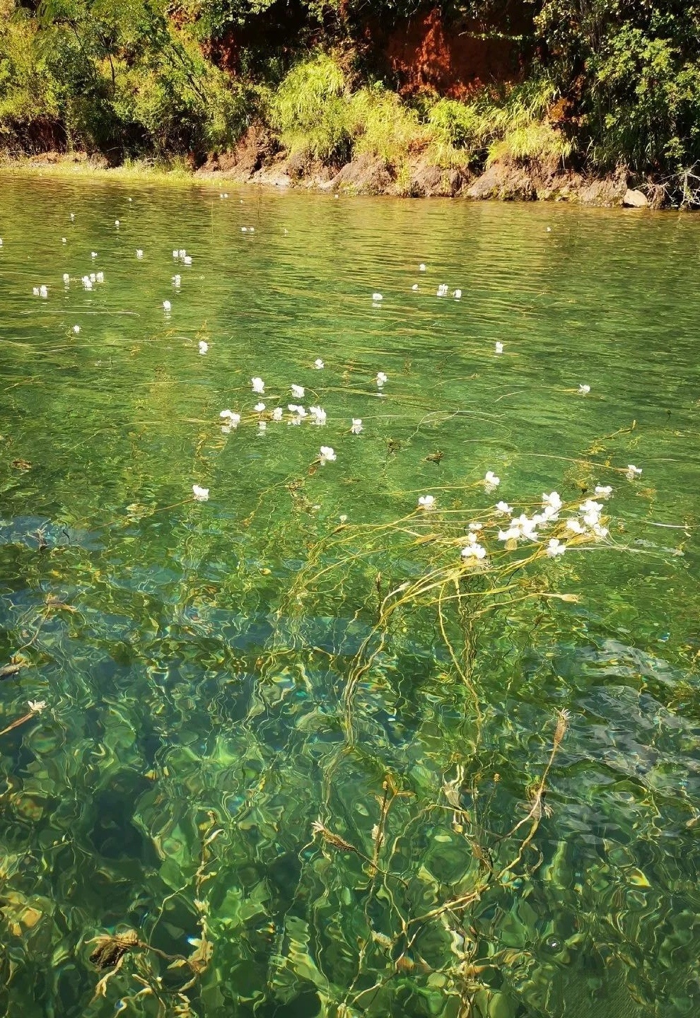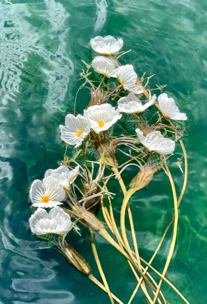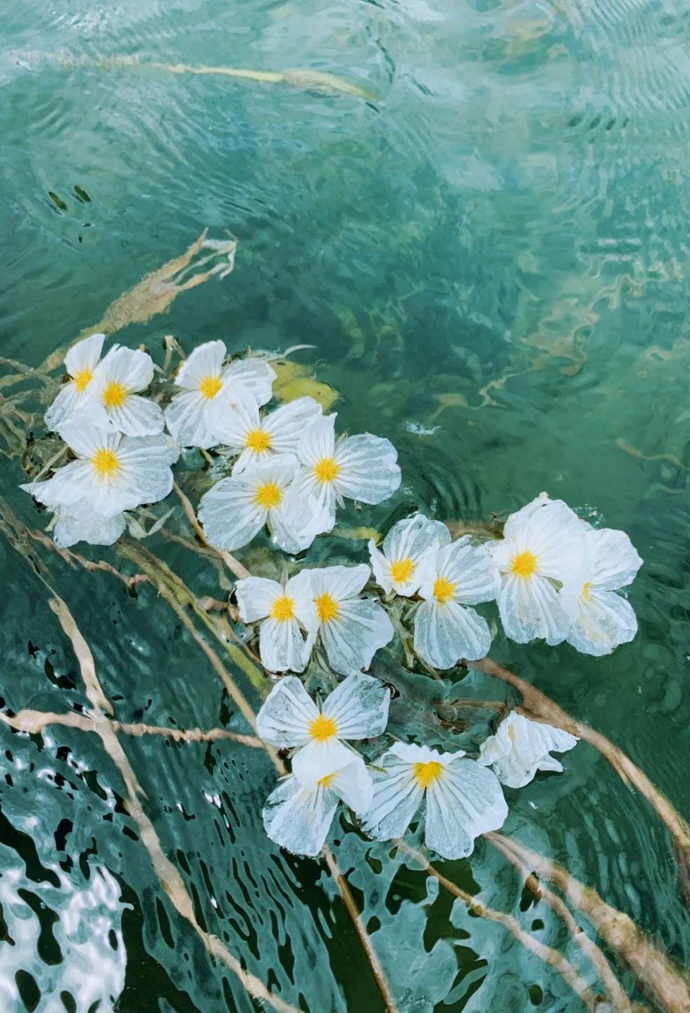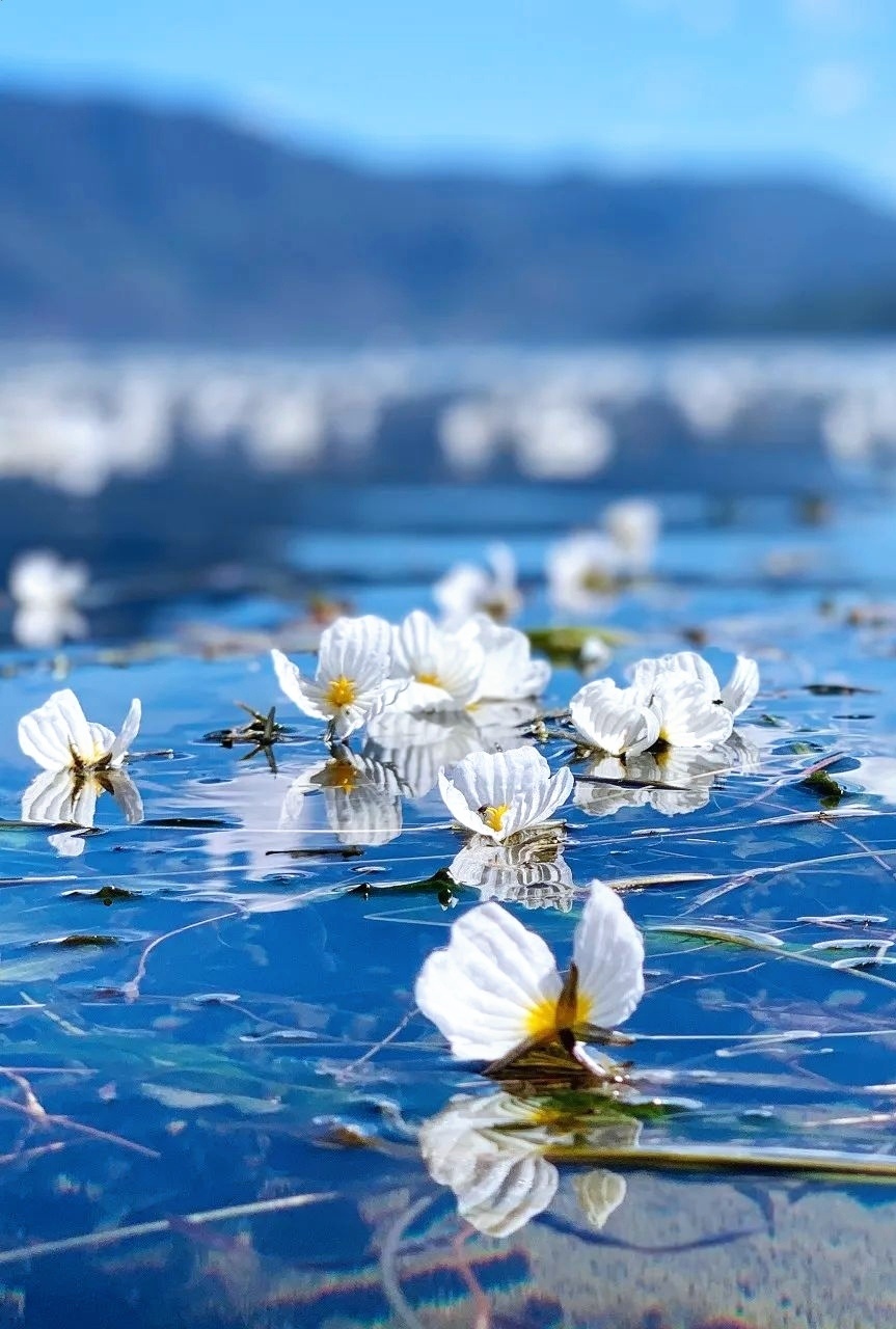 其花有白色花瓣金黄伪花蕊,远看仿若繁星点缀湖面,其根生长在水中,花儿却铺撒水而,清新脱俗宛如天空仙子,美丽动人让人神秘!
