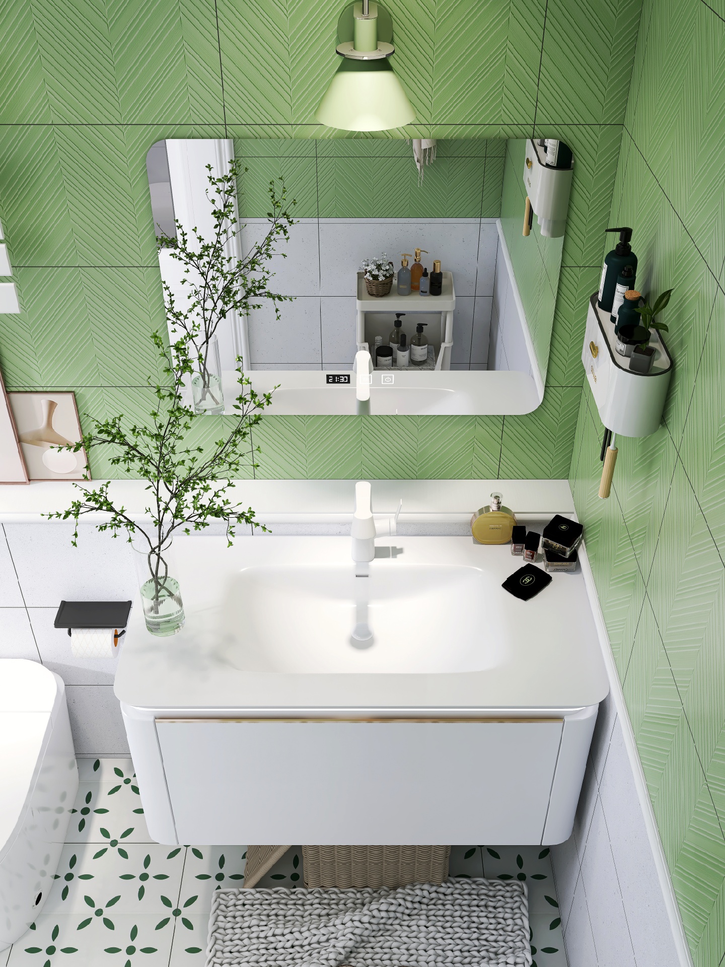 🍃 纯白的浴室柜,简约大方,镜子成像非常高清👀,拥有的照明和除雾功能带来极大方便👍,实木的柜子可以存放不少物品~