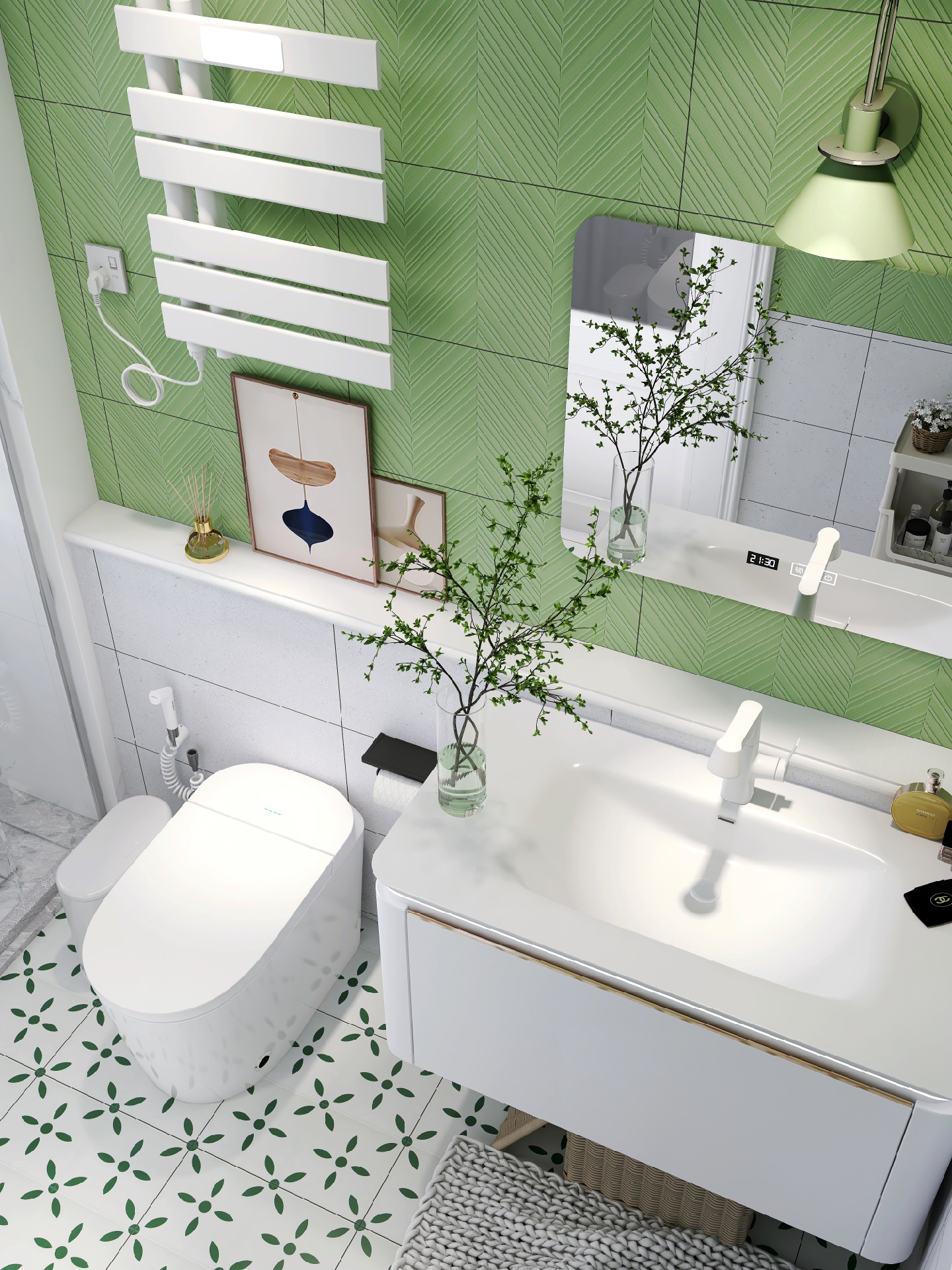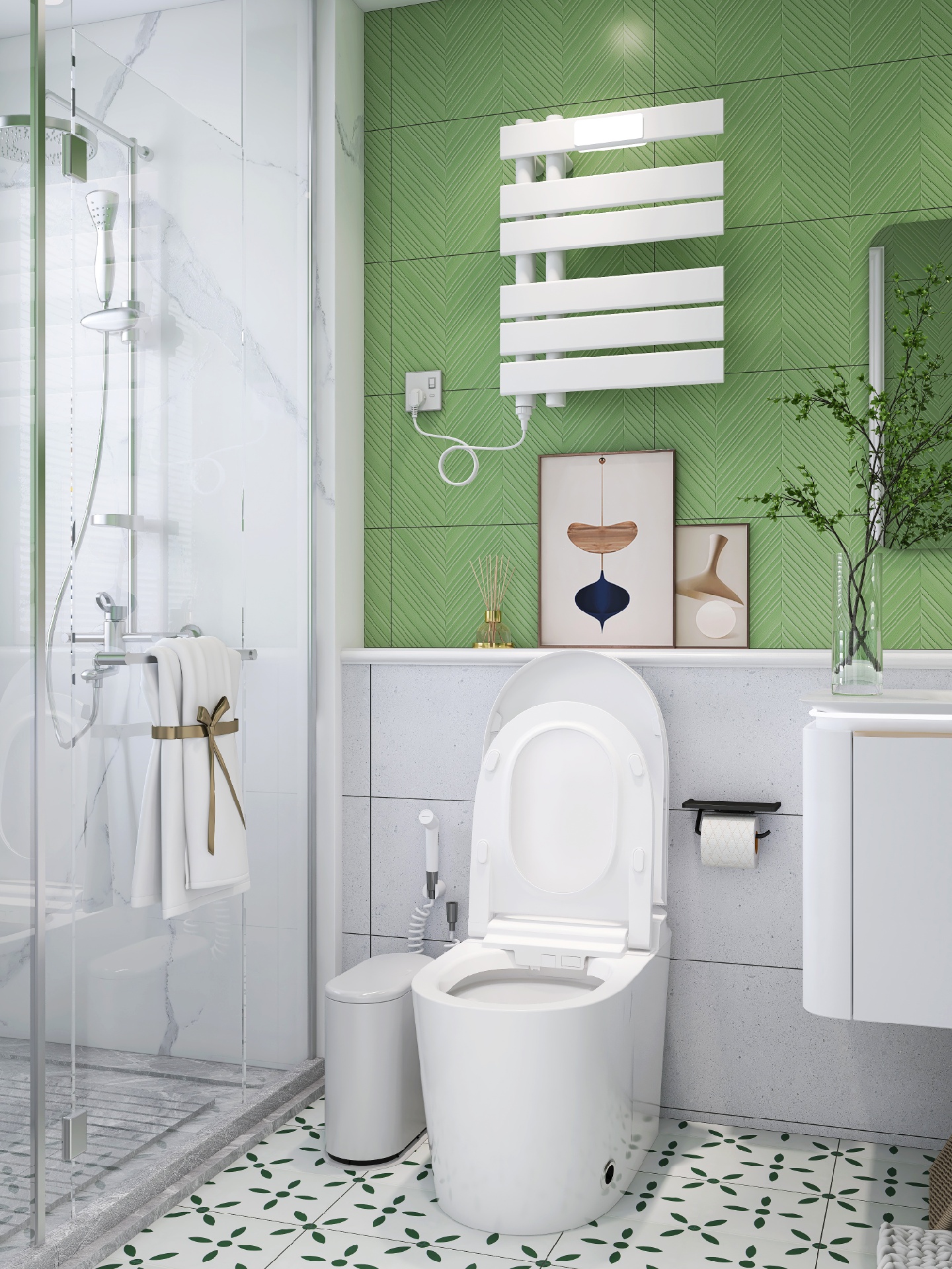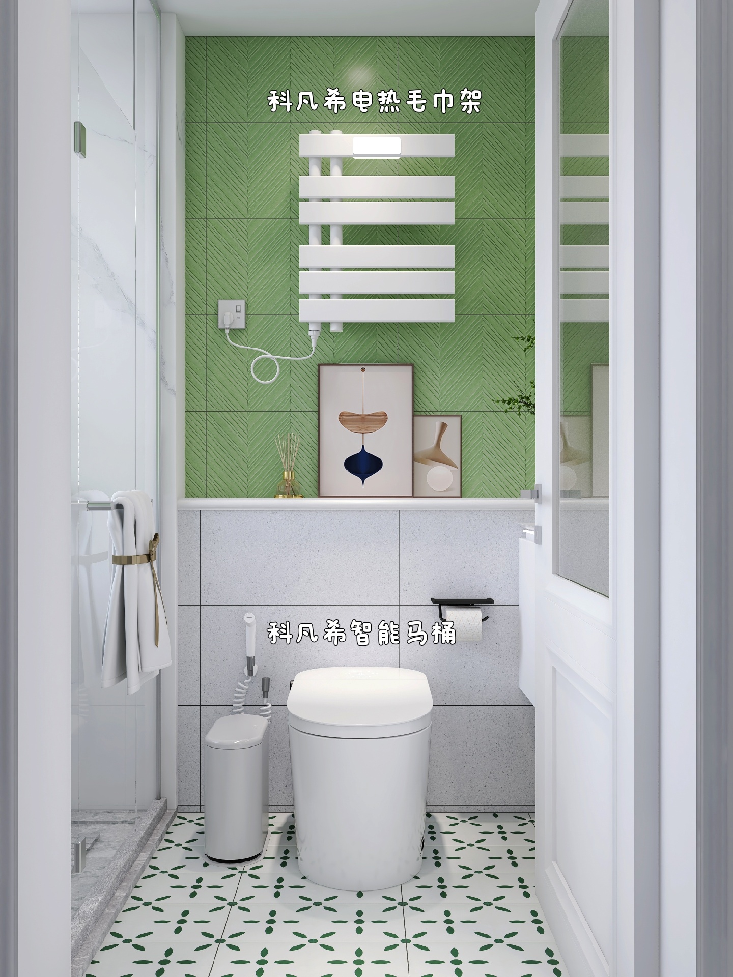 🍃 墙面是白绿相间的,搭配带有绿色元素的地砖和纯白的卫浴🛀,淋浴间以透明玻璃隔断,显得浴室更加通透和宽敞✨