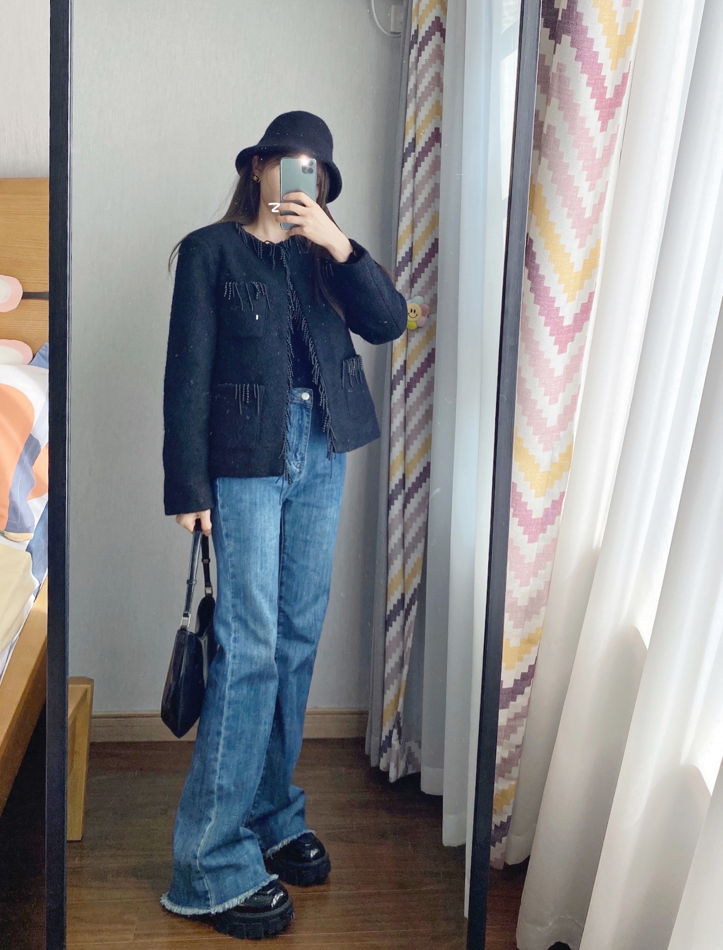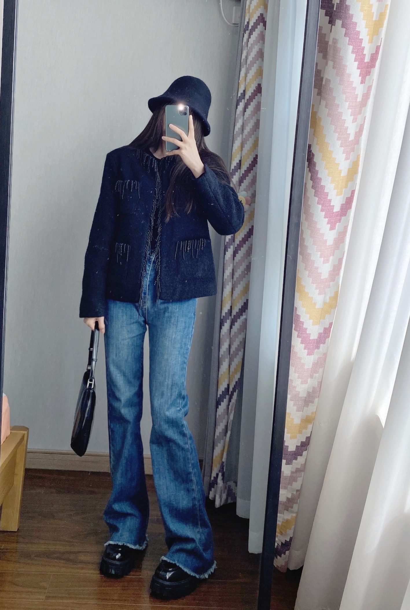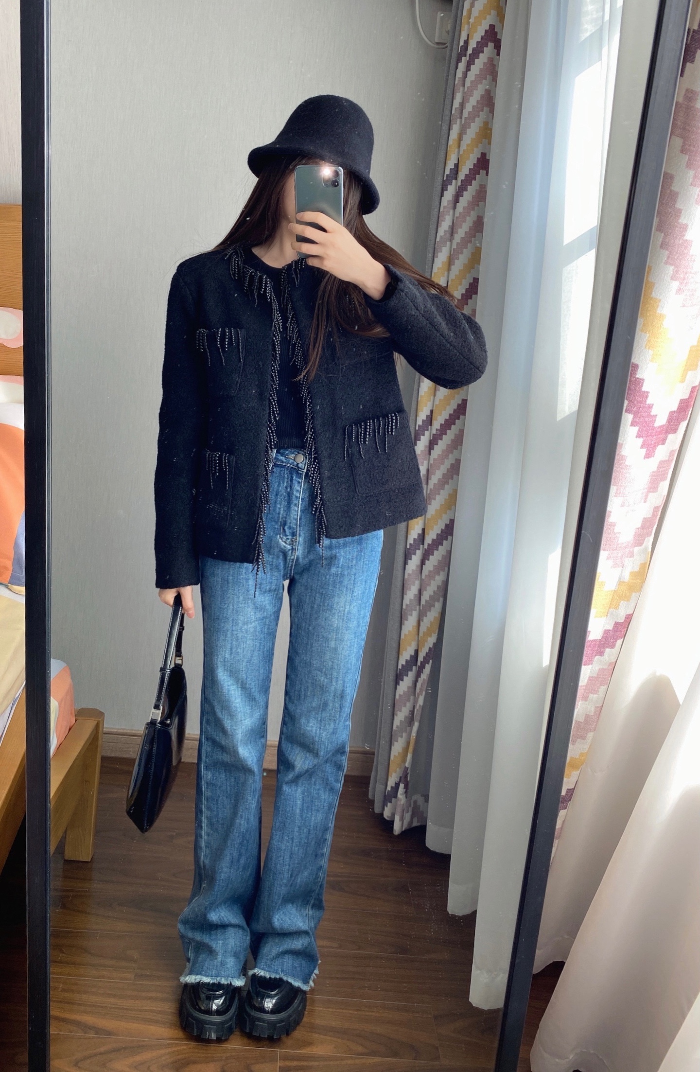 今天是黑色珠串小香风羽绒服搭配微喇牛仔裤,配一双厚底鞋,牛仔裤里还可以穿秋裤,保暖拿捏住了!@MT情报局 @MT小美酱