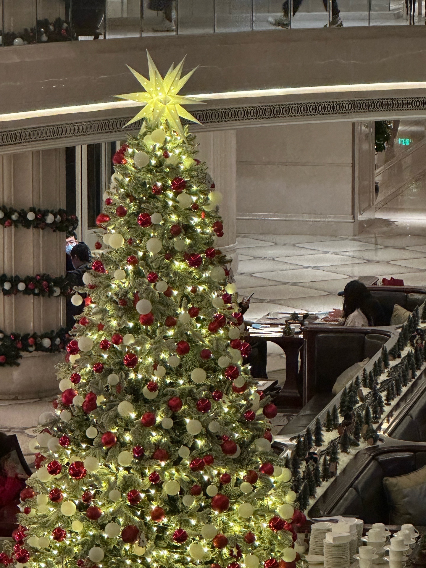 最大的圣诞树在旧楼的挑空大堂,有一些用餐座位,可以预定或者现场取号,北欧圣诞赏味套餐:北欧特色风味菜品一份 + 甜品一份 + 饮品一杯 268r☕️,比半岛酒店要实惠太多💫
