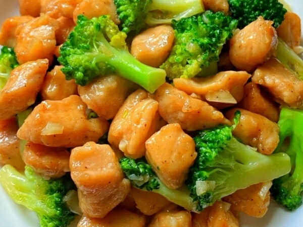 4、起锅烧油,油热后放入鸡胸肉翻炒,炒至变色后放入蒜末翻炒出香味,再放入西蓝花翻炒均匀。