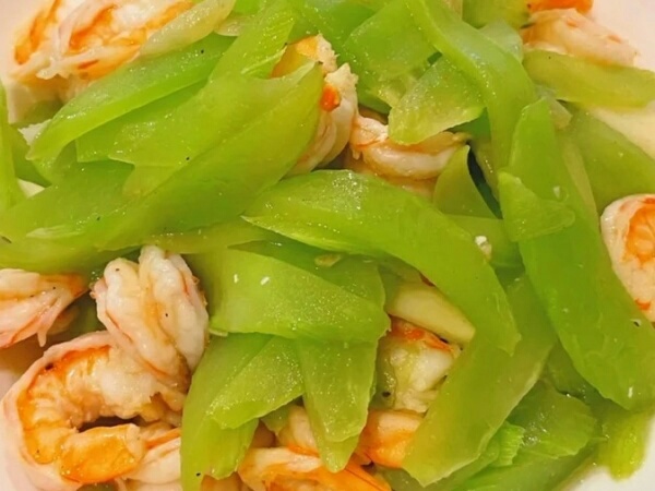 2、起锅烧油,油热后放入蒜末爆香,再放入莴笋翻炒均匀,炒至莴笋变软之后,就可以放入虾仁翻炒均匀。