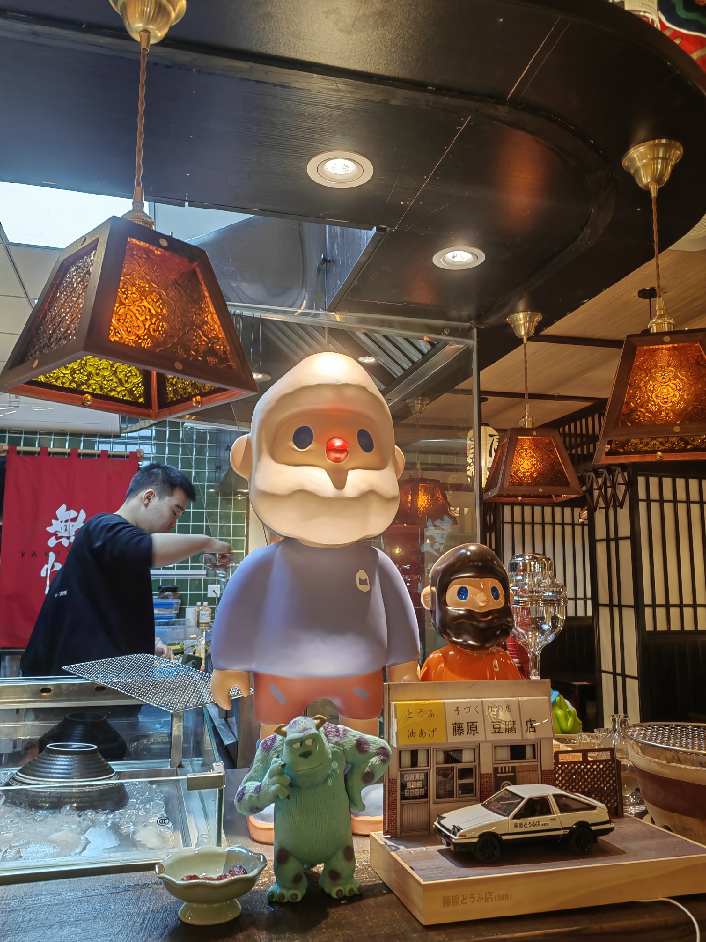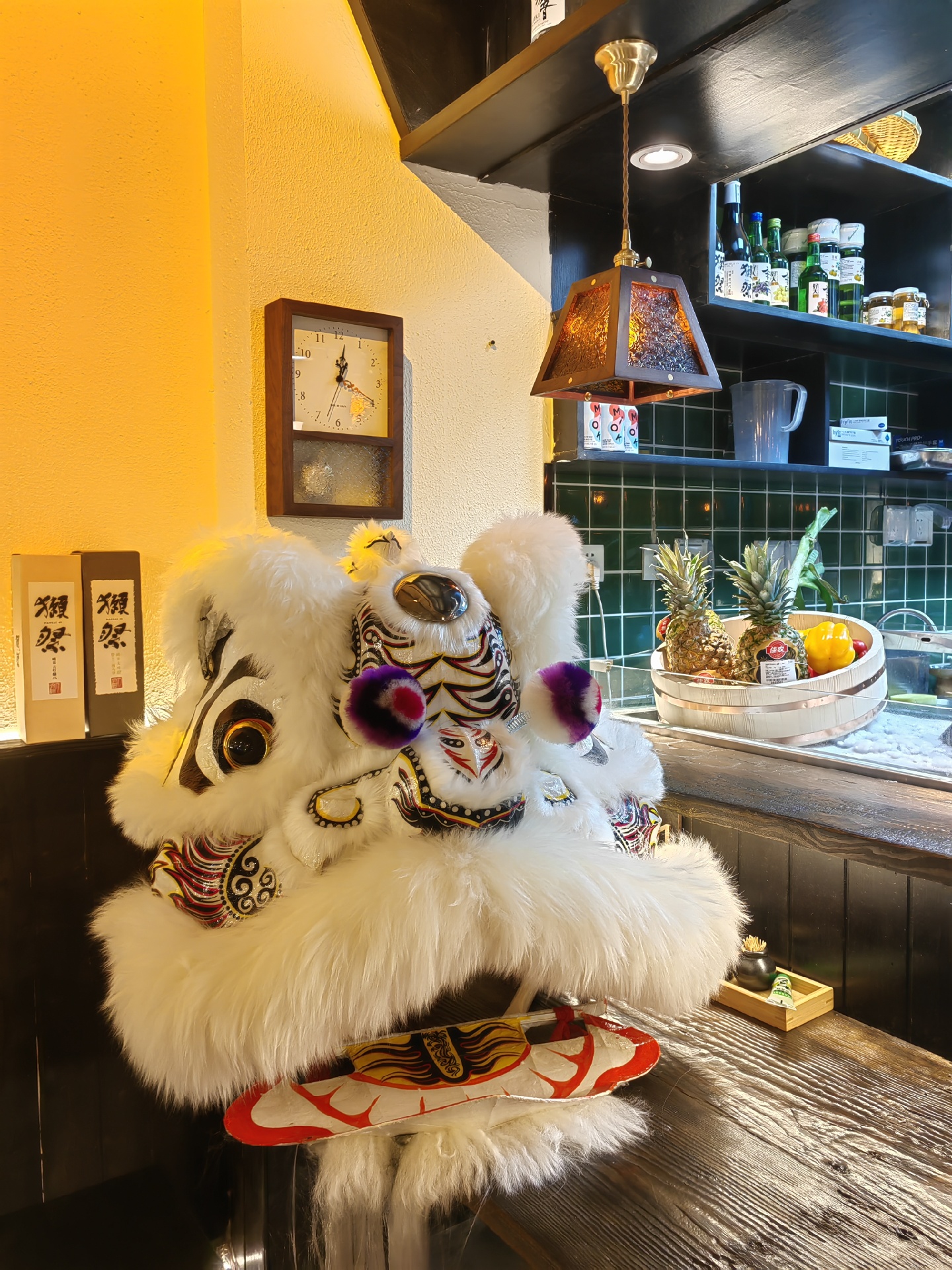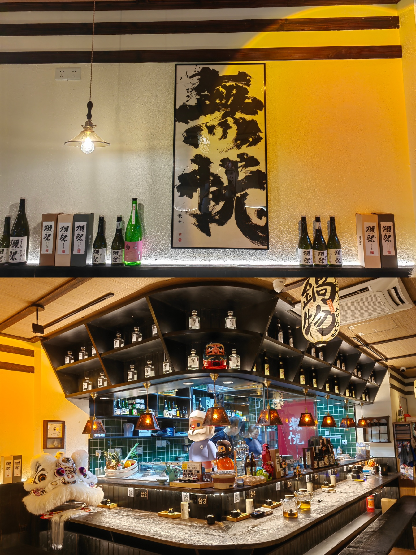 室内装修是日式小酒馆🍶那种很温馨舒适的环境,摆放了很多手办和动漫招贴画,直觉店主应该是个“二次元中二病”哈哈~柜台上放着舞狮子的摆设还是挺有意思的,倒是没看到有居酒屋这么混搭🦁