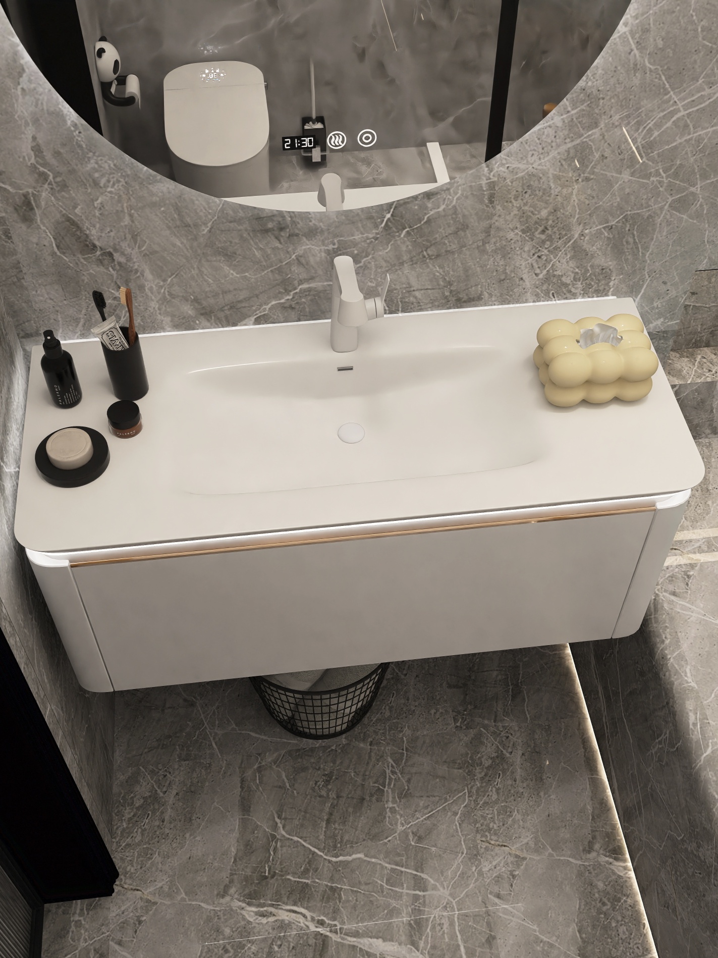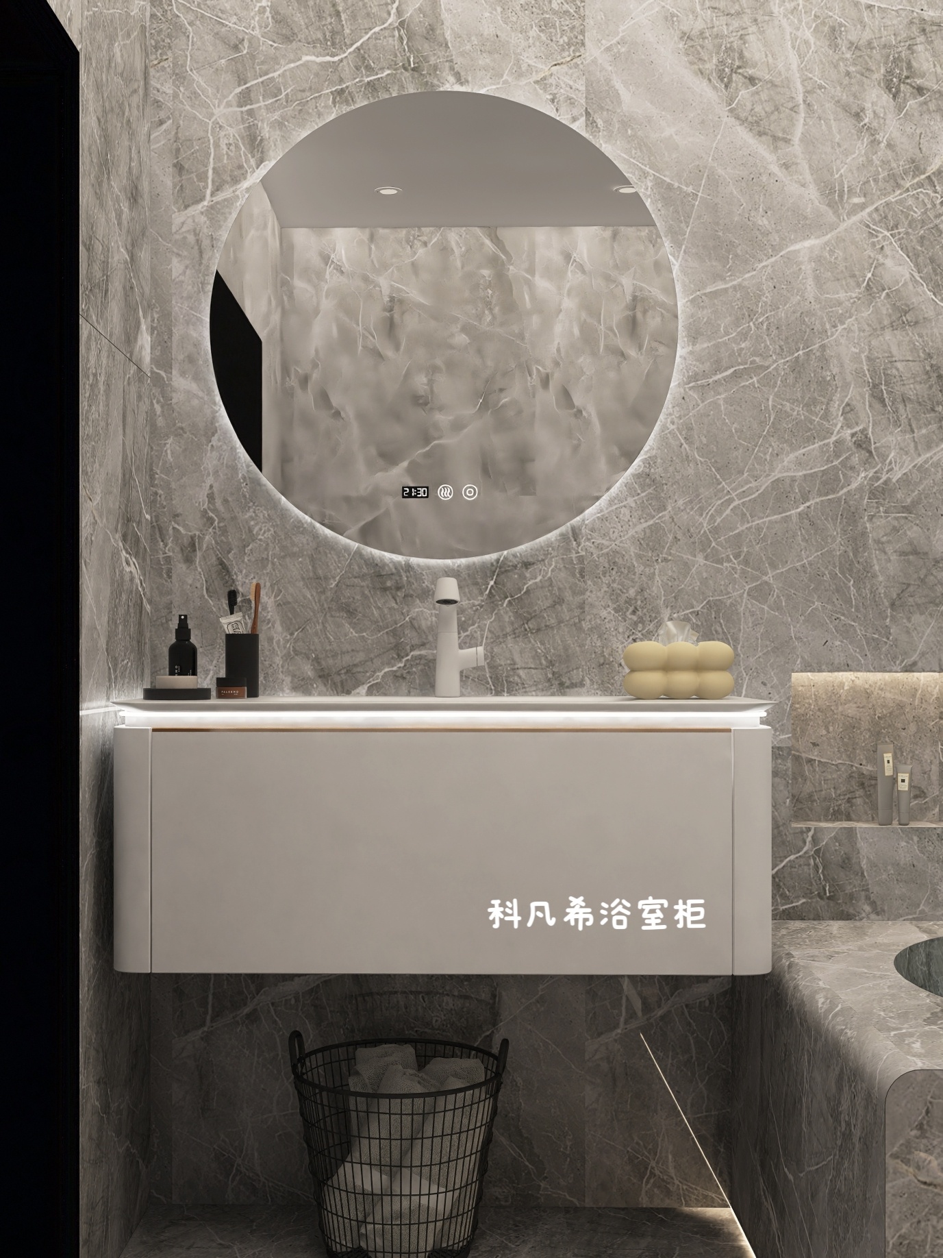 ▲悬挂式浴室柜,圆形的镜子超美✨照明除雾两不误!琦美石一体盆,无卫生死角好打理👋实木的柜子,收纳空间大!