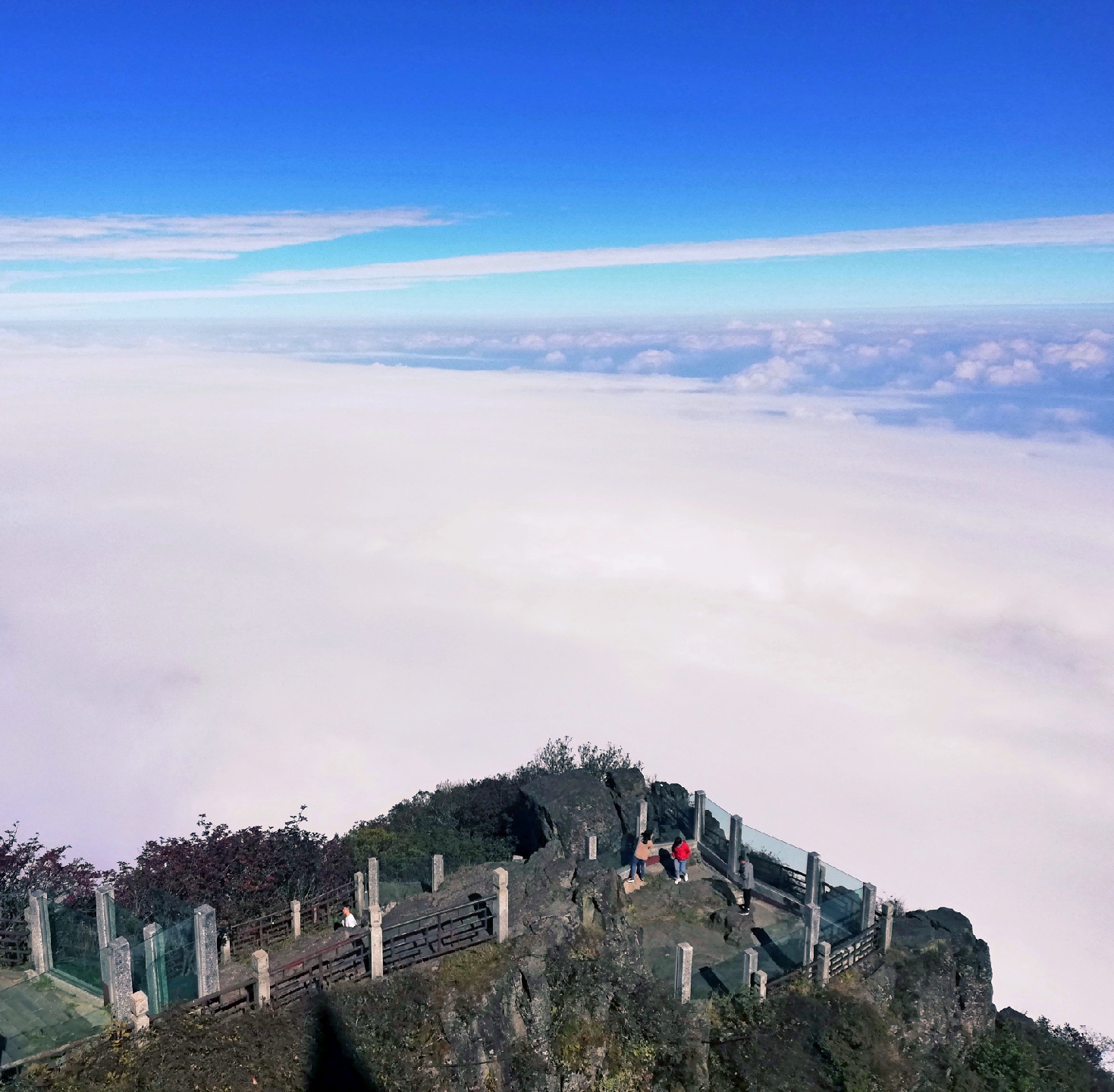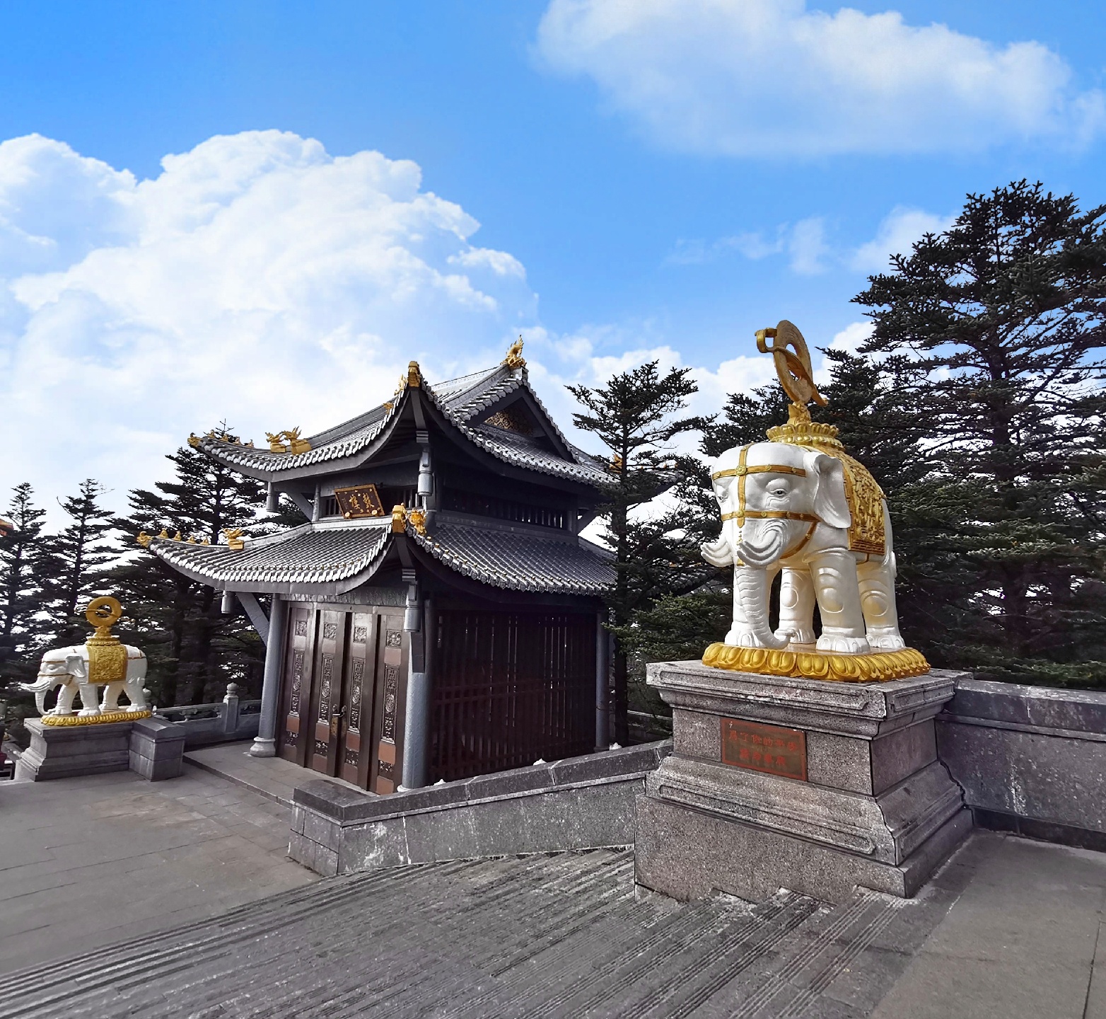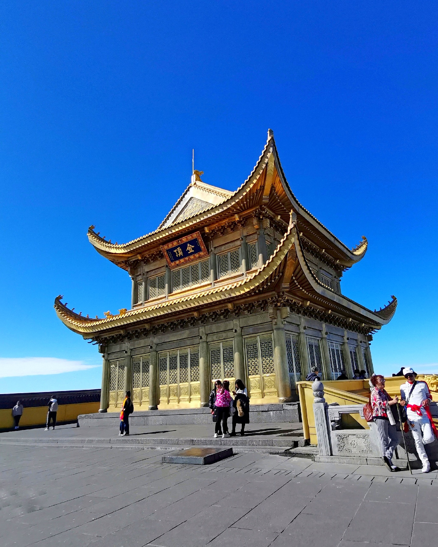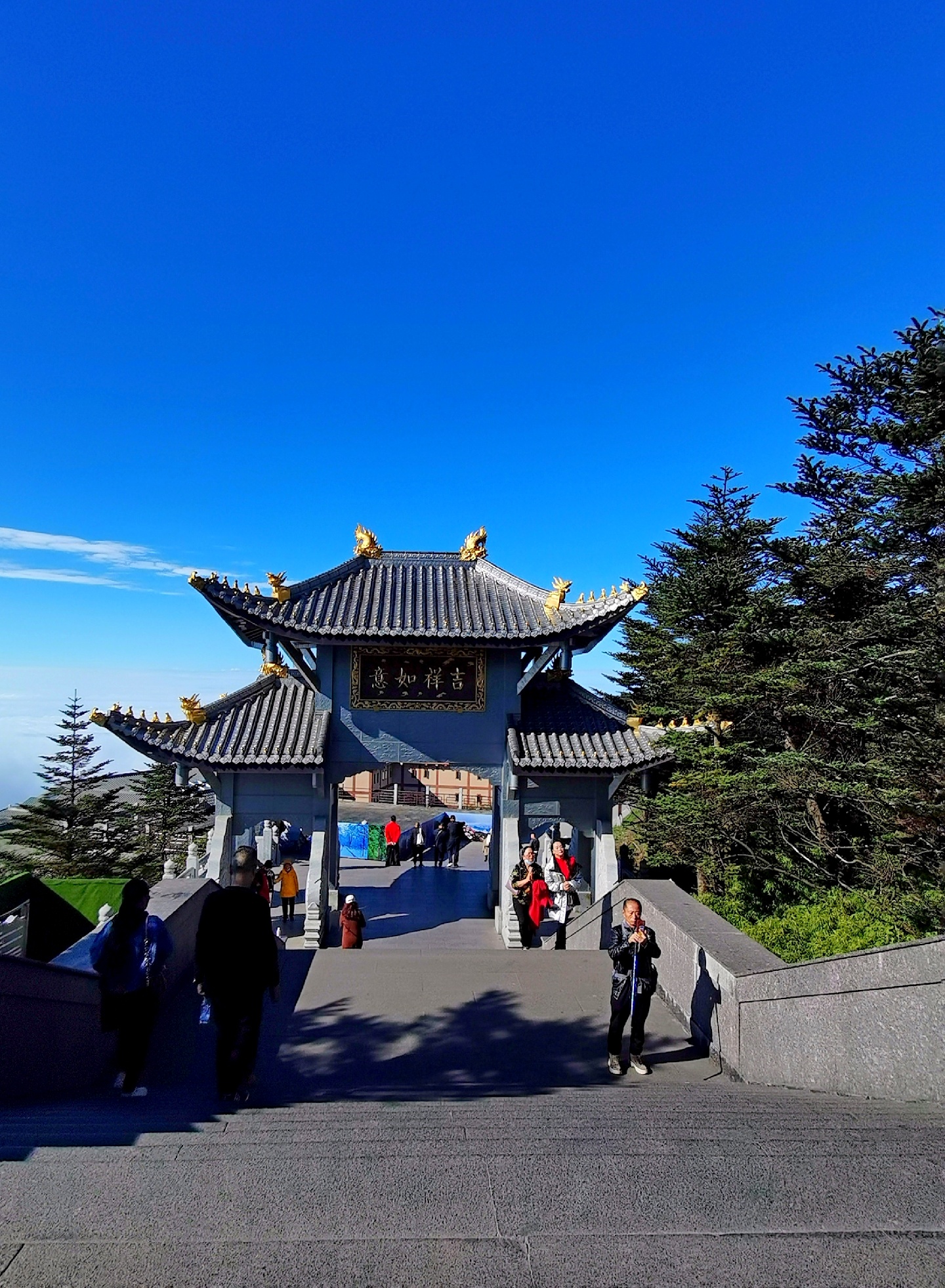 登上金顶可观看峨眉山四大奇观,日出、云海、佛光、圣灯。金顶与千佛顶、万佛顶相印,万佛顶上亦有建筑。金顶是峨眉山寺庙和景点最集中的地方,名胜云集,精华所在。峨眉山层峦叠嶂,山势雄伟,景色秀丽,气象万千,自然和人文景观都非常美好。(3)