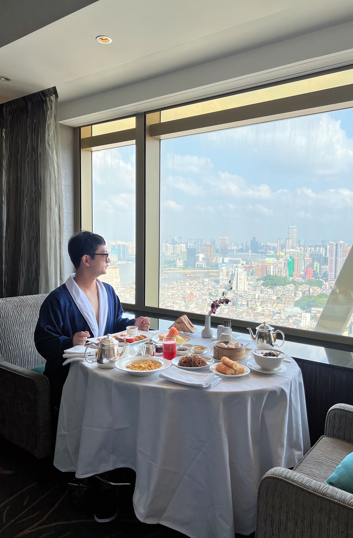 整个房间设计大气,全景落地玻璃窗,可以俯瞰澳门半岛,视野绝佳,住在这里,绝对是一种视觉享受。