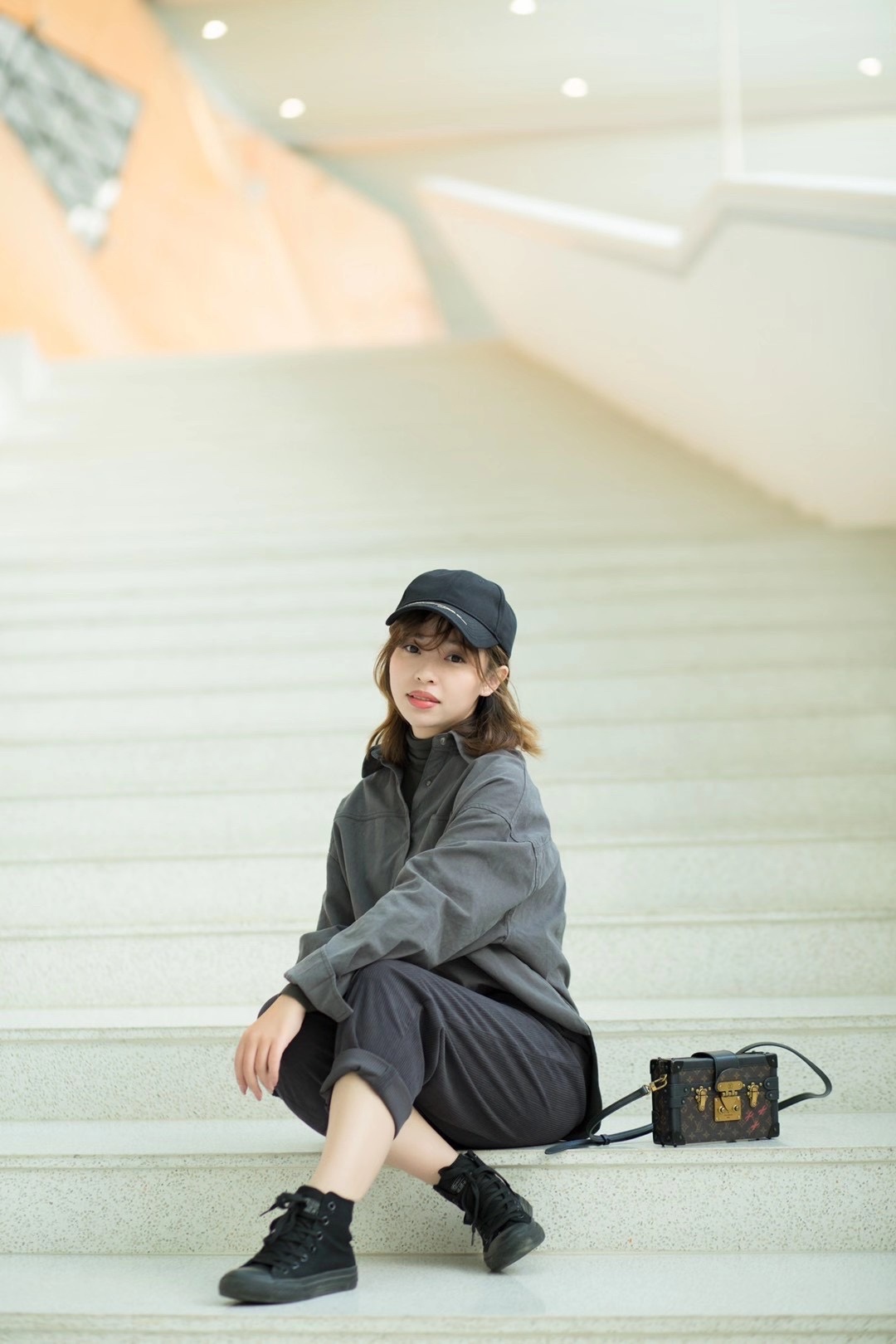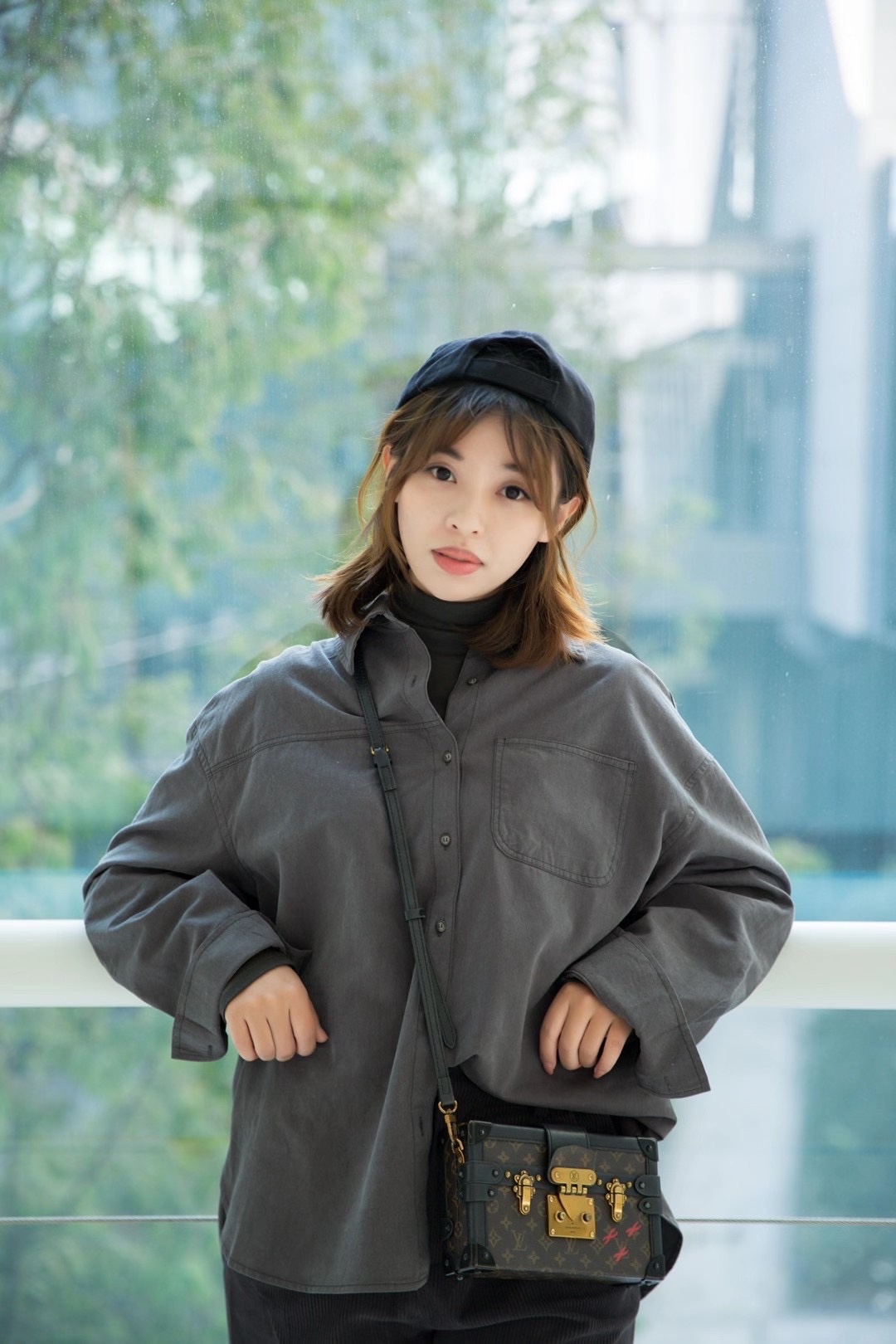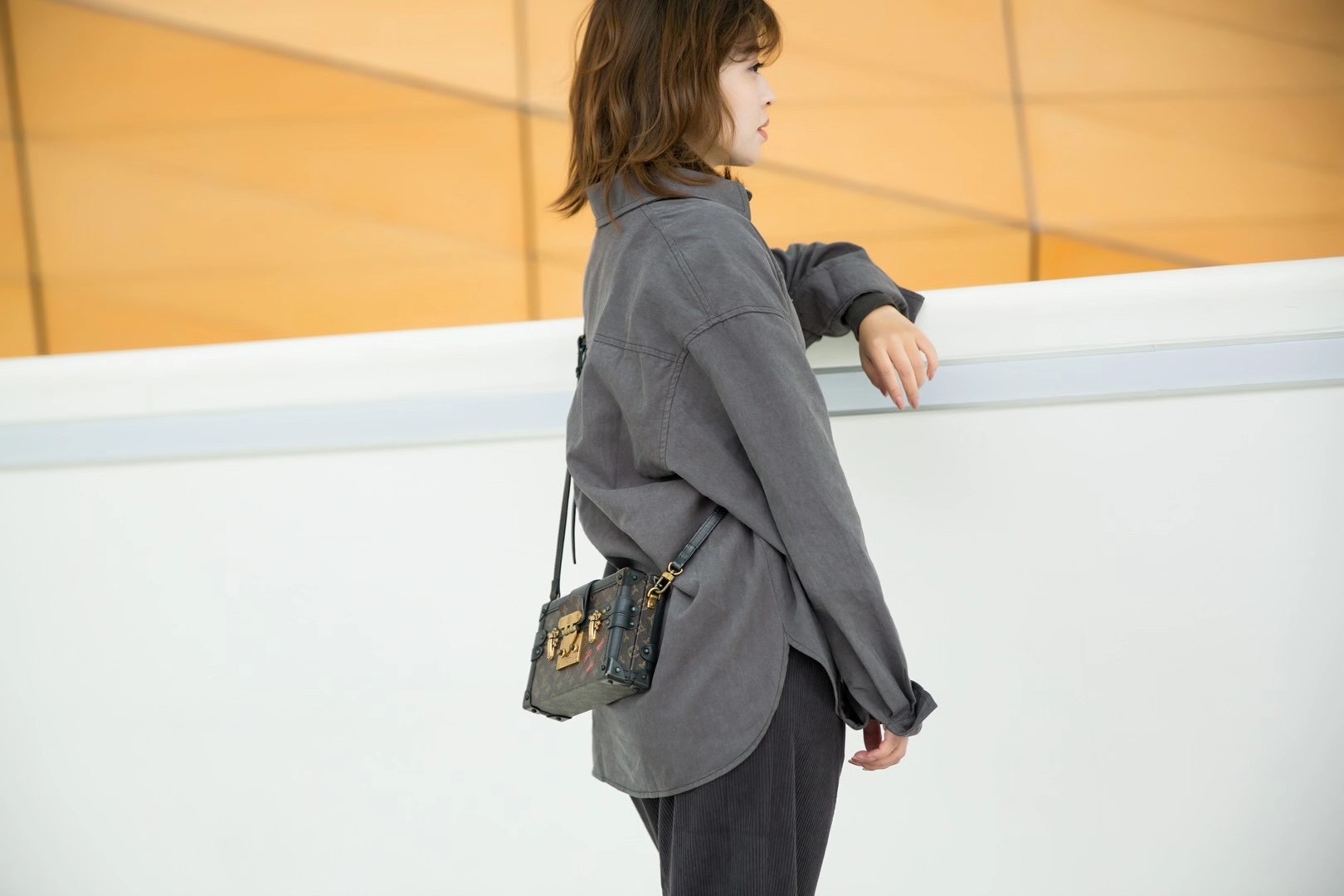 内搭:灰色半高领。 外套衬衫。裤子深灰条绒