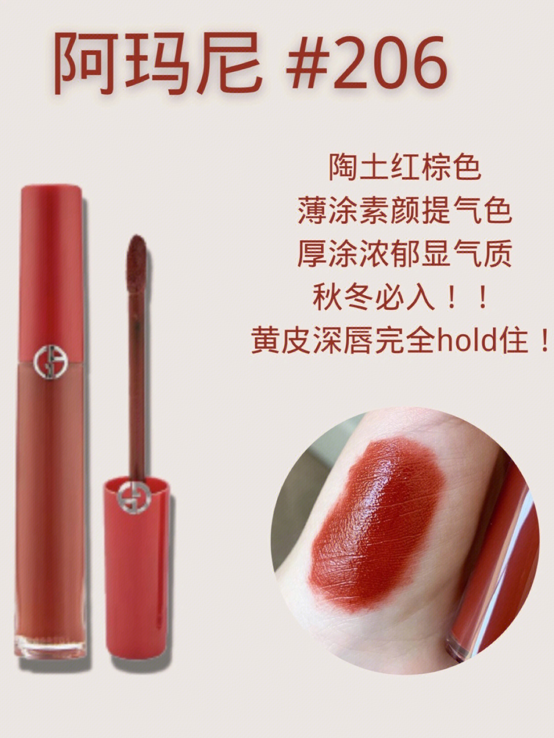 适合秋冬的陶土红棕色(被同事要链接的一支!!)加重了红棕色调,弱化了土色,薄涂纯欲,厚涂气质,深唇黄皮的姐妹也很适合 。 丝绒质地,亲测不涂唇膏上嘴也不会拔干,搭配秋冬妆容就很“高级感”~