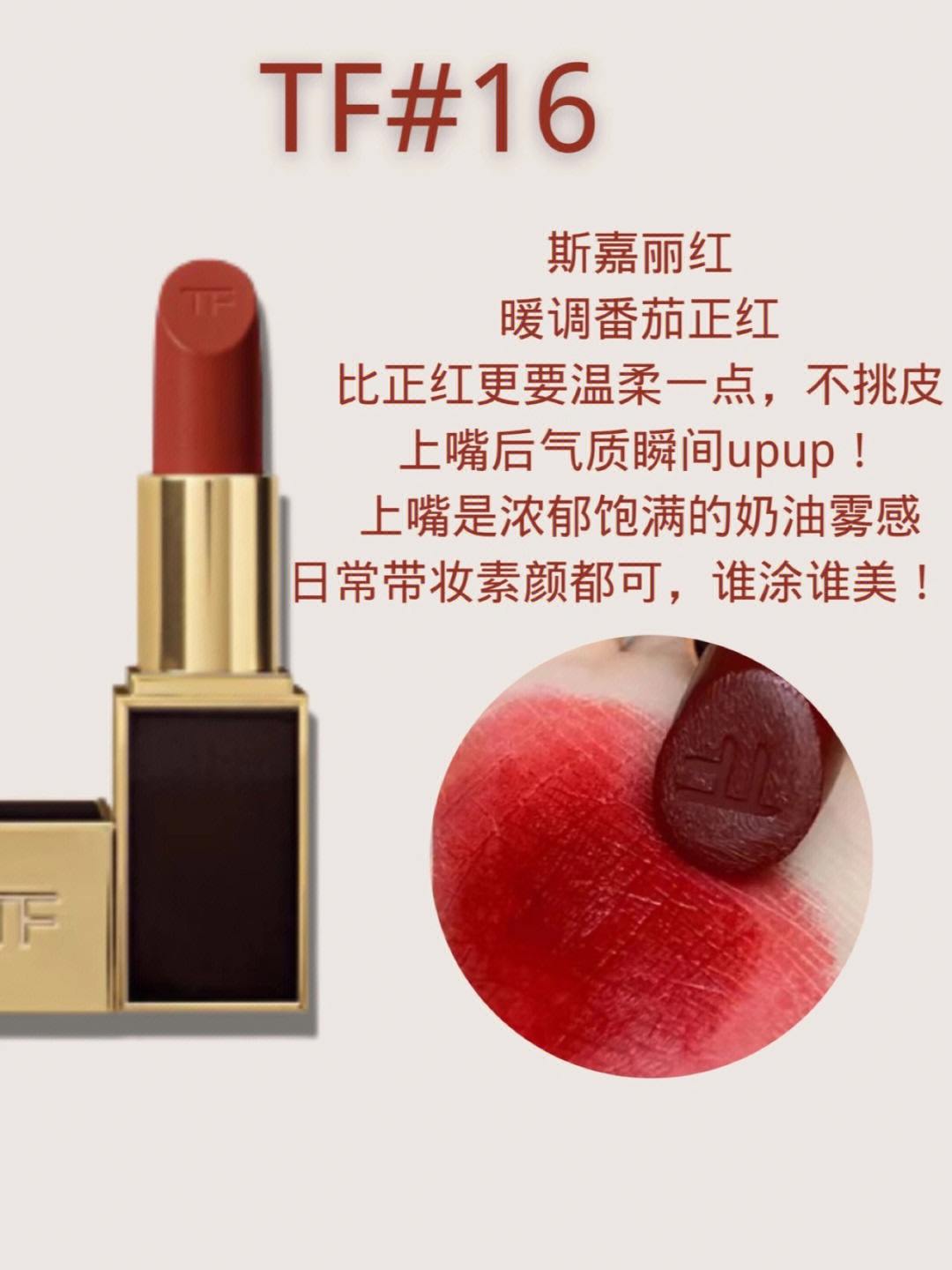 斯嘉丽红,暖调番茄正红,比正红更要温柔一点,不挑皮,上嘴后气质瞬间upup!奶油质地款,上嘴是浓郁饱满的奶油雾感,丝滑不卡唇纹,色泽浓郁,显色度很好,日常带妆素颜都可,谁涂谁美!!