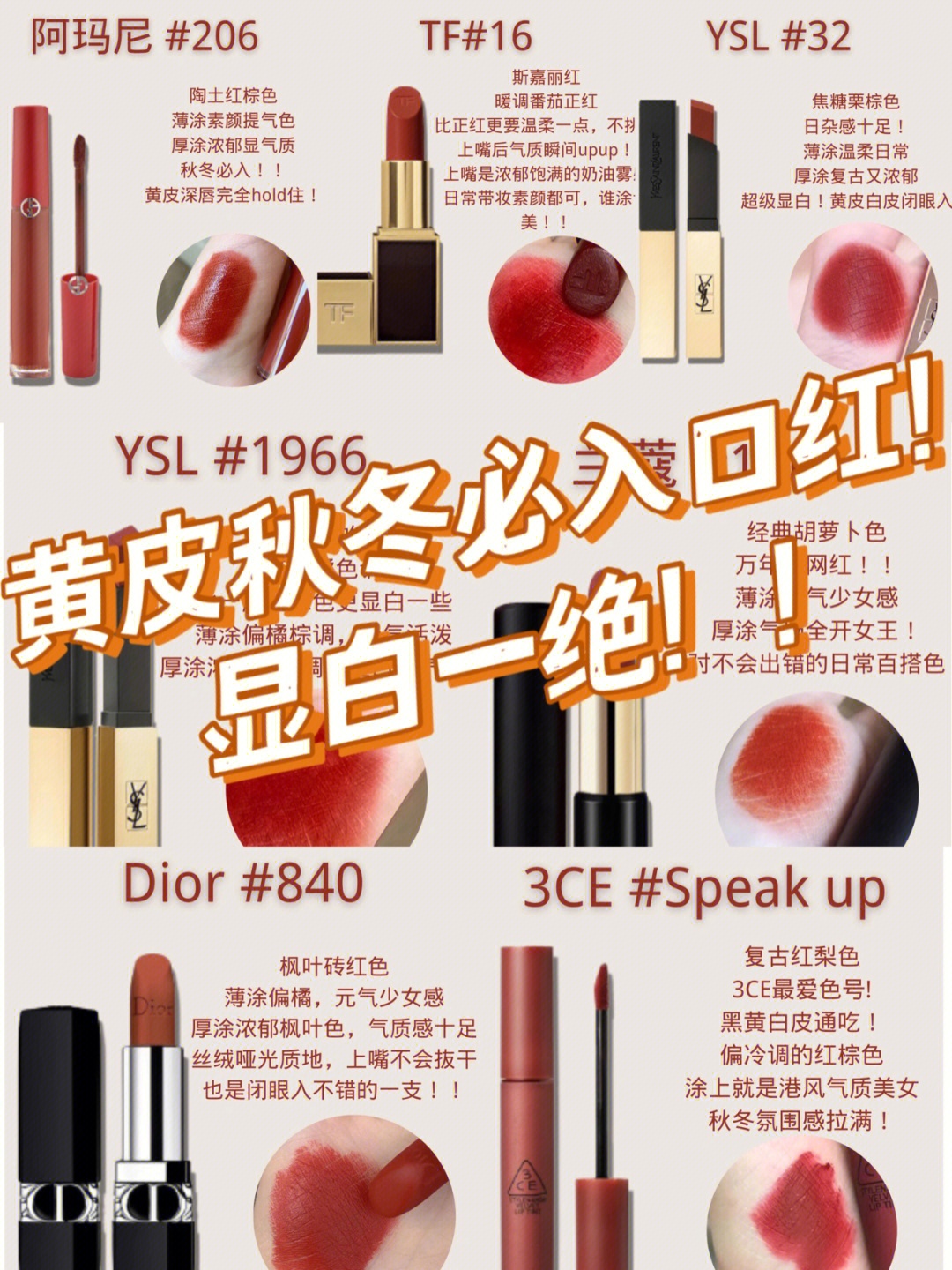 标题:黄皮女孩秋冬必备宝藏口红❗️妈见夸系列‼️__文案描述:今天整理了一波适合黄皮秋冬的显白口红,推荐给大家。氛围感一绝!通勤挚爱!!💋💋