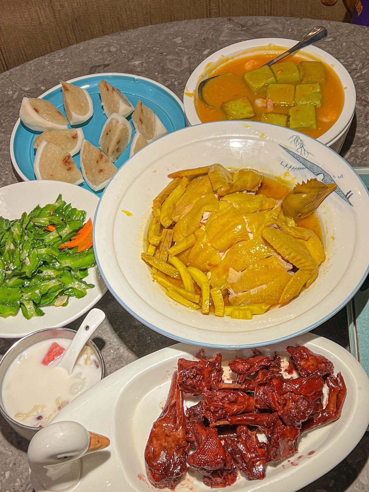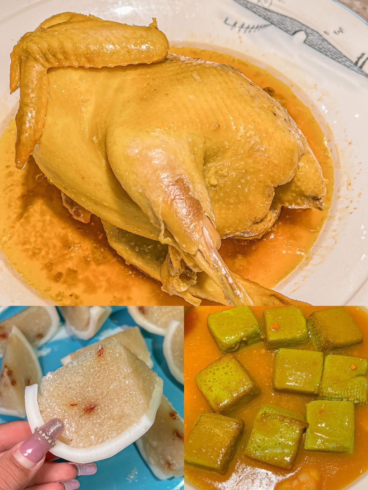 ✨椰子文昌鸡🐔:嘿嘿,椰子🥥味的鸡肉呢,表面就是金黄色的,但是里面的肉就很嫩主要汁水味已经完全融入到肉里面😍