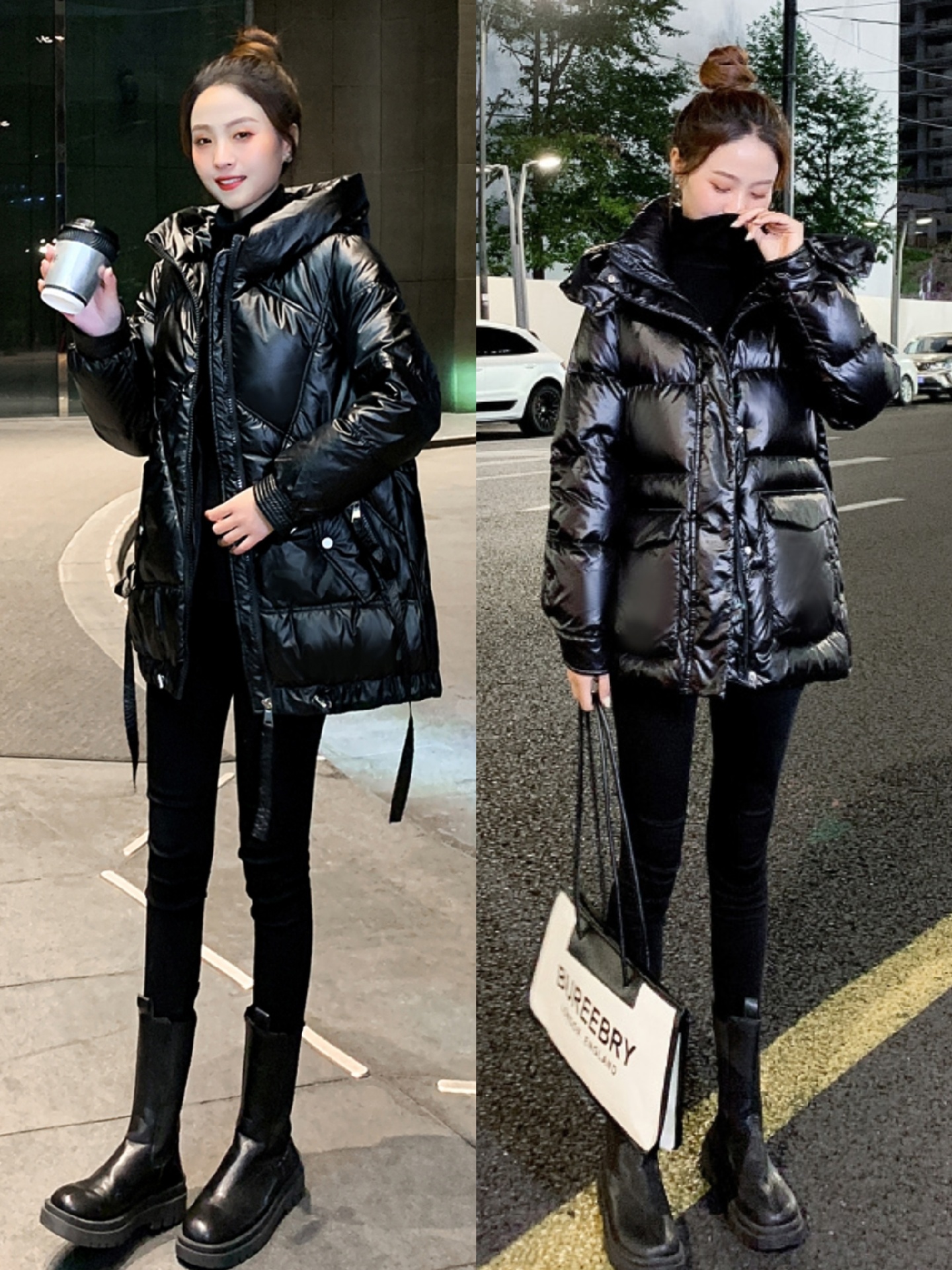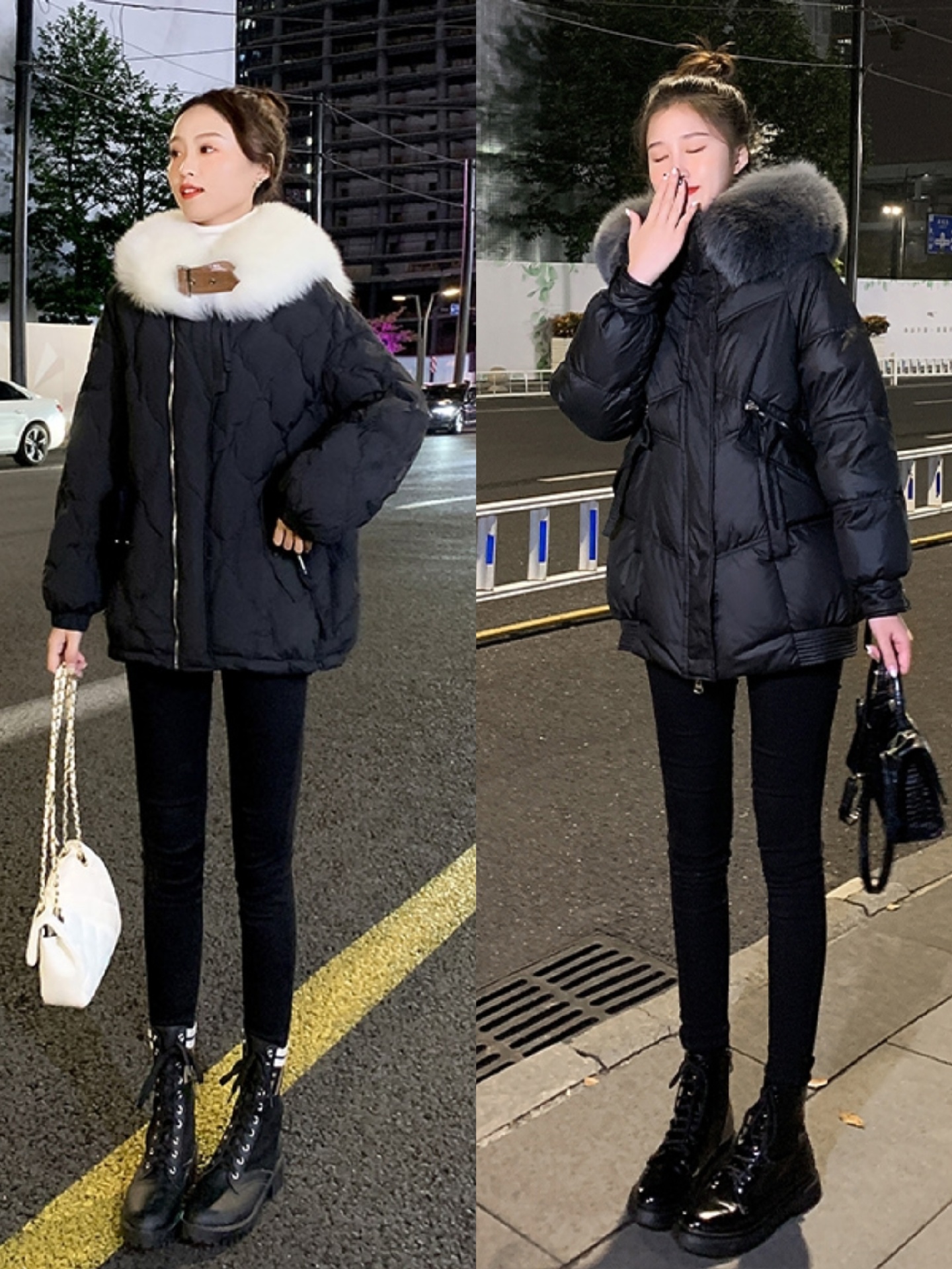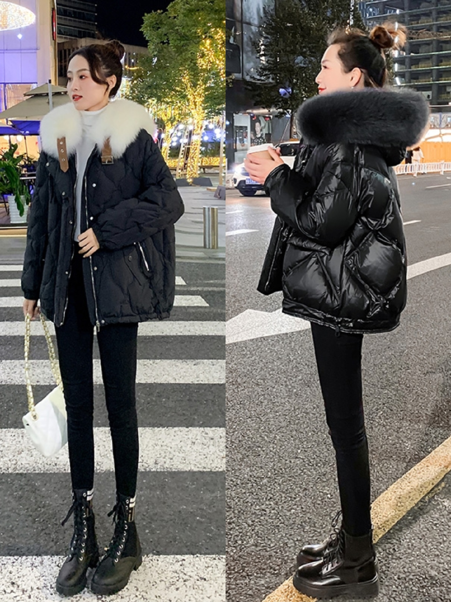 短款羽绒服还可以搭配打底裤,小黑裤。