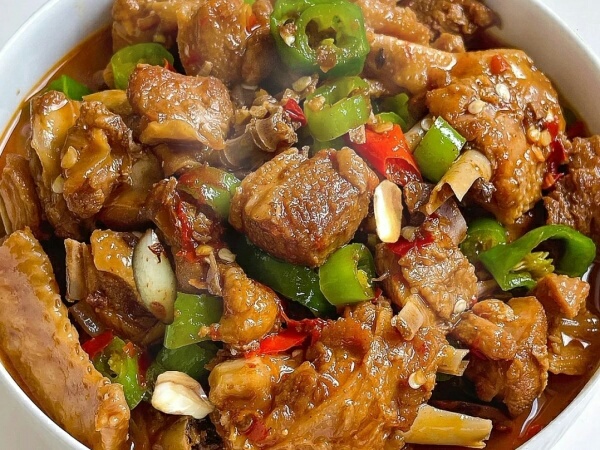 2、起锅烧油,油热后放入鸭肉翻炒一会儿,炒干水分炒出油脂,炒至鸭肉微焦,再放入姜片和小米辣翻炒均匀。